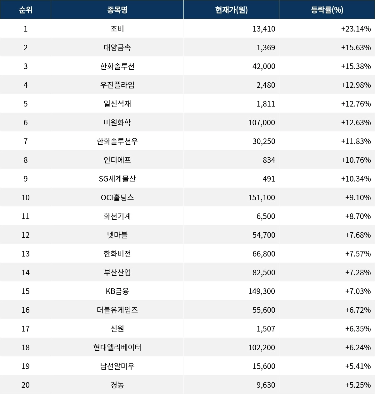 6위 미원화학(134380)은 10만 7,000원으로 12.63% 상승 마감했다. 7위 한화솔루션우(009835)는 종가 3만 250원으로 11.83% 상승 마감했다. 8위 인디에프(014990)는 종가 834원으로 10.76% 상승 마감했다. 9위 SG세계물산(004060)은 491원으로 10.34% 상승 마감했다. 10위 OCI홀딩스(010060)는 15만 1,100원으로 9.10% 상승 마감했다.