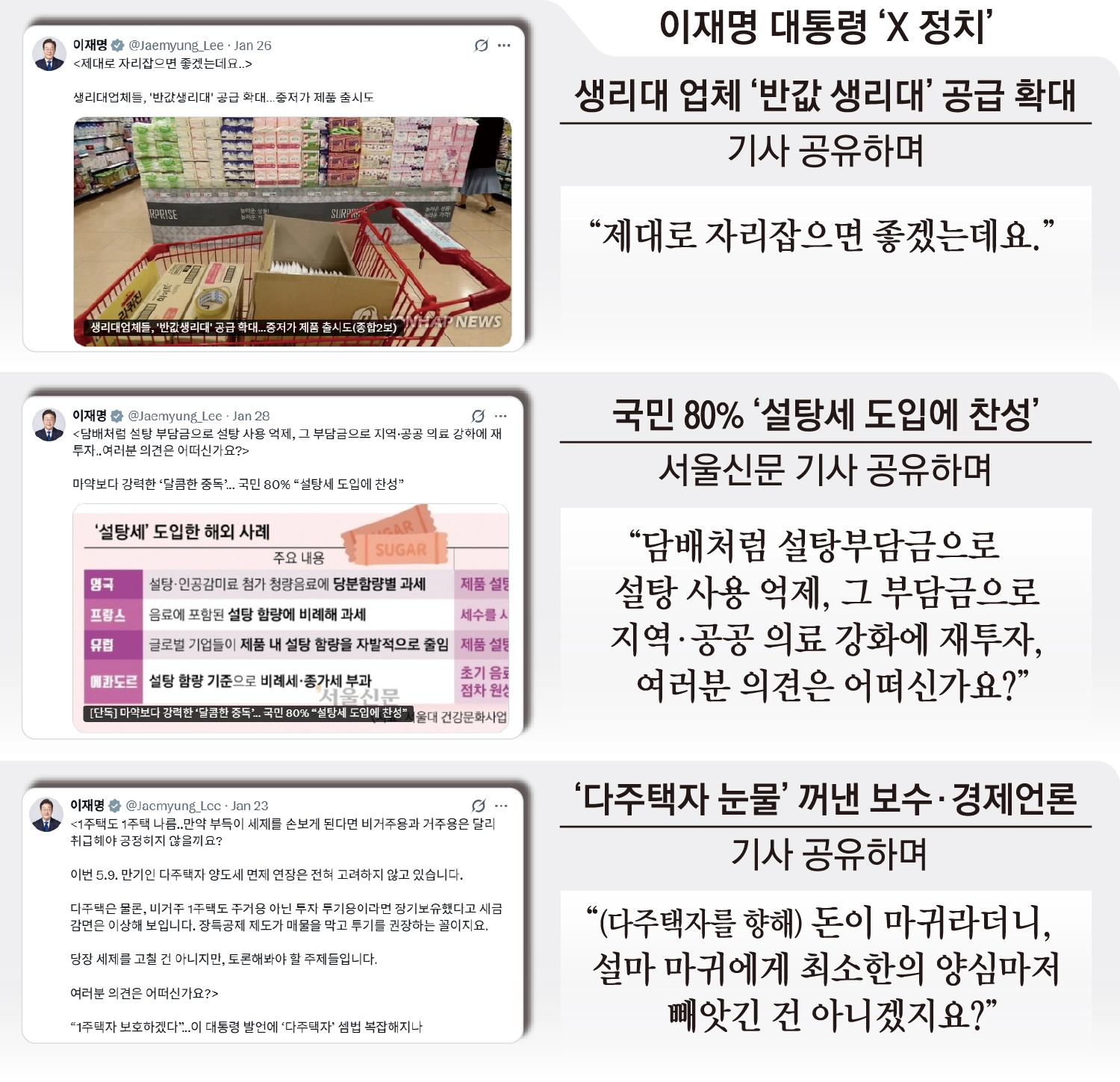 이 대통령은 지난달 23일 “다주택자 양도세 면제 연장은 전혀 고려하지 않고 있다”는 내용을 시작으로 8일까지 X에 다주택자를 압박하는 메시지를 17개 올렸다. 거의 하루에 1개꼴이다.