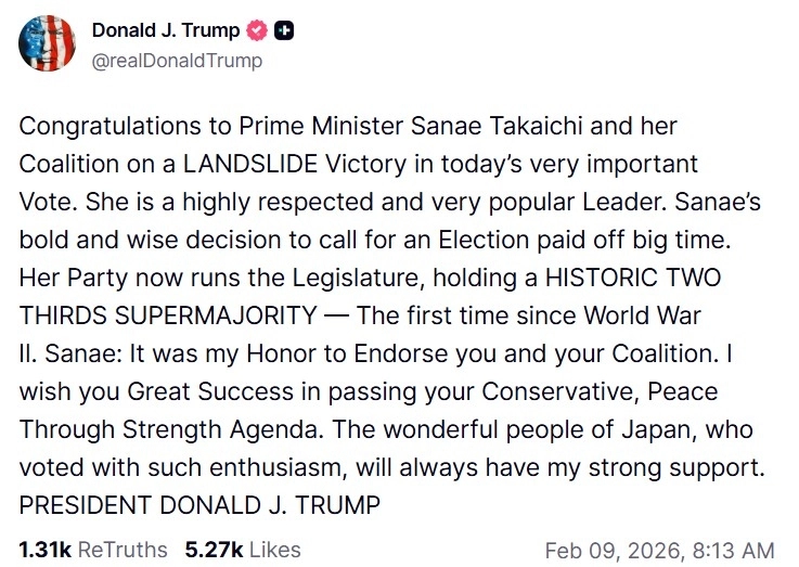 다카이치 총리는 정권 기반 강화를 위해 지난달 중의원(하원)을 해산하고 조기 총선을 실시해 전체 의석의 3분의 2 이상을 확보하면서 정국 주도권을 쥐게 됐다. 트럼프 대통령은 “총선을 치르기로 한 사나에의 대담하고 현명한 결정이 큰 성과를 거뒀다. 이는 제2차 세계대전 이후 처음 있는 일”이라면서 “당신과 당신의 연합(자민당-일본유신회 연립여당)을 지지한 것은 내 영광이었다”고 밝혔다. 이어 “당신의 보수적인 ‘힘을 통한 평화’ 의제를 이행하는데 위대한 성과가 있기를 바란다”면서 “열정적으로 투표한 훌륭한 일본 국민 여러분께서는 언제나 저의 강력한 지지를 받으실 것이다”라고 덧붙였다.