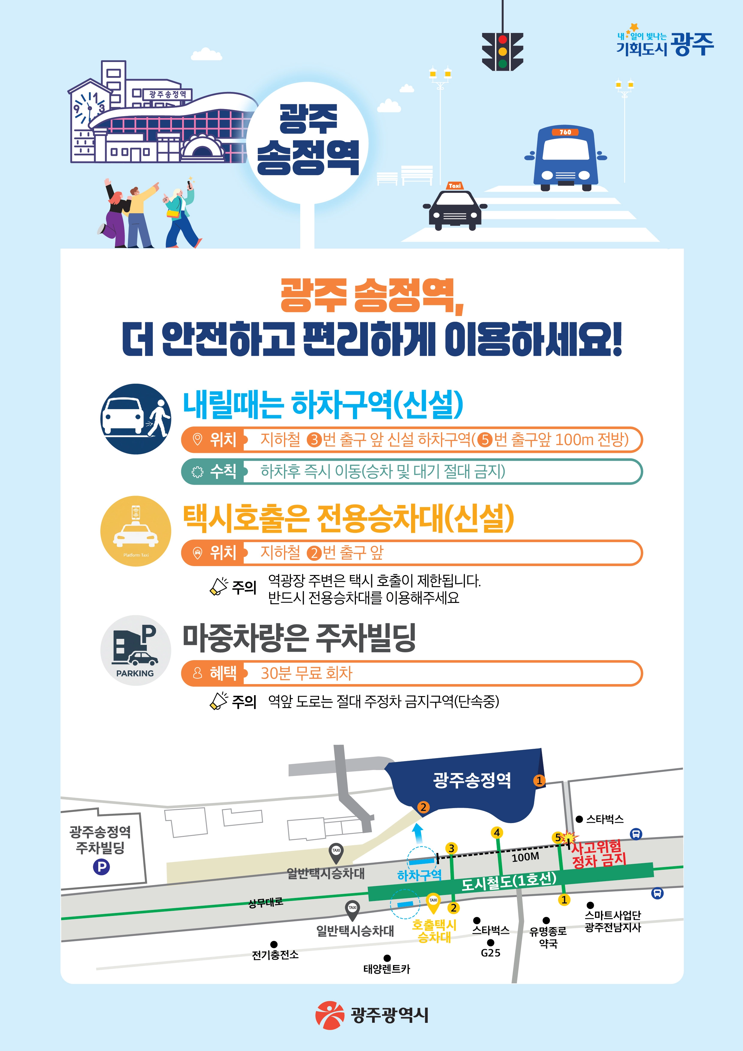 광주시는 도시철도(지하철) 광주송정역 5번 출구 인근에 집중돼 있던 승하차 차량의 혼잡을 개선하기 위해 전방 약 100m 지점인 3번 출구 앞에 ‘하차 전용구역’을 새롭게 조성했다.