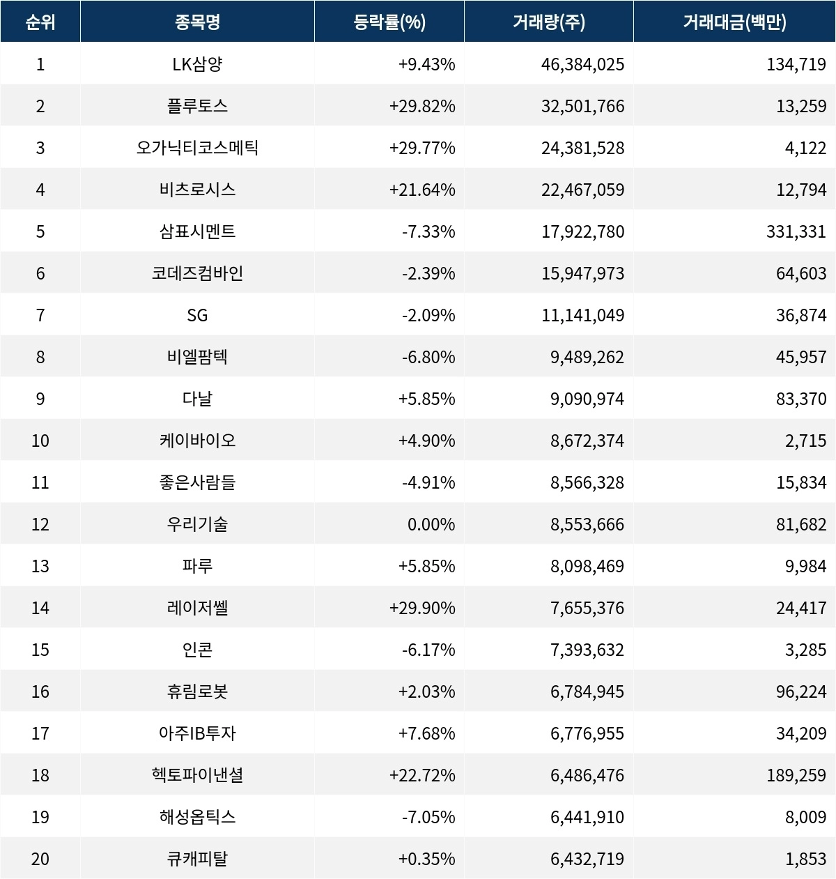 [서울데이터랩]금일 코스닥 거래량 1위 LK삼양 거래대금 무려 134억원 돌파