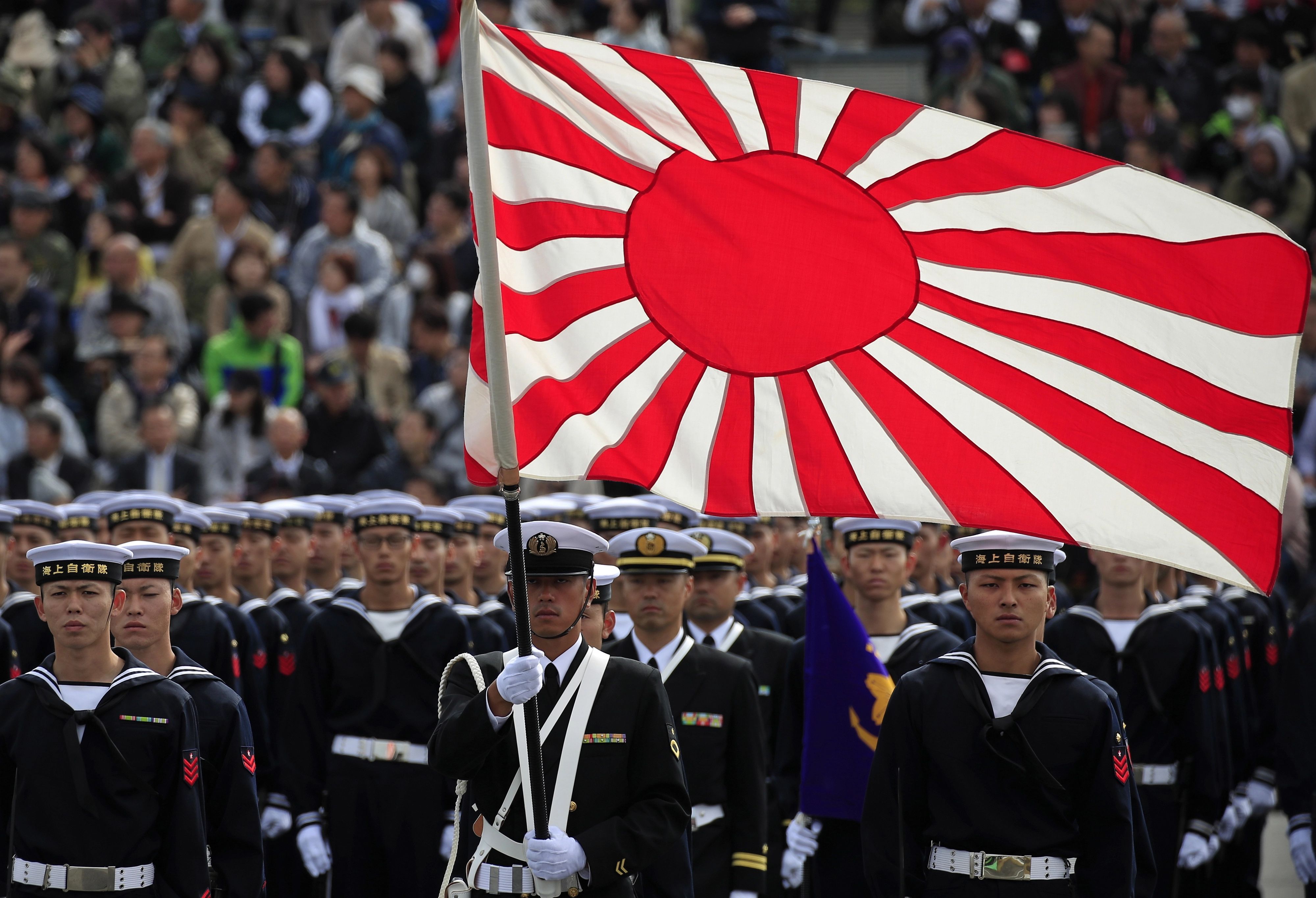 일본 해상자위대 대원들이 2018년 10월 14일 일본 도쿄 인근 아사카에서 열린 육상자위대 아사카 훈련장 군사 퍼레이드에 참석하고 있다.