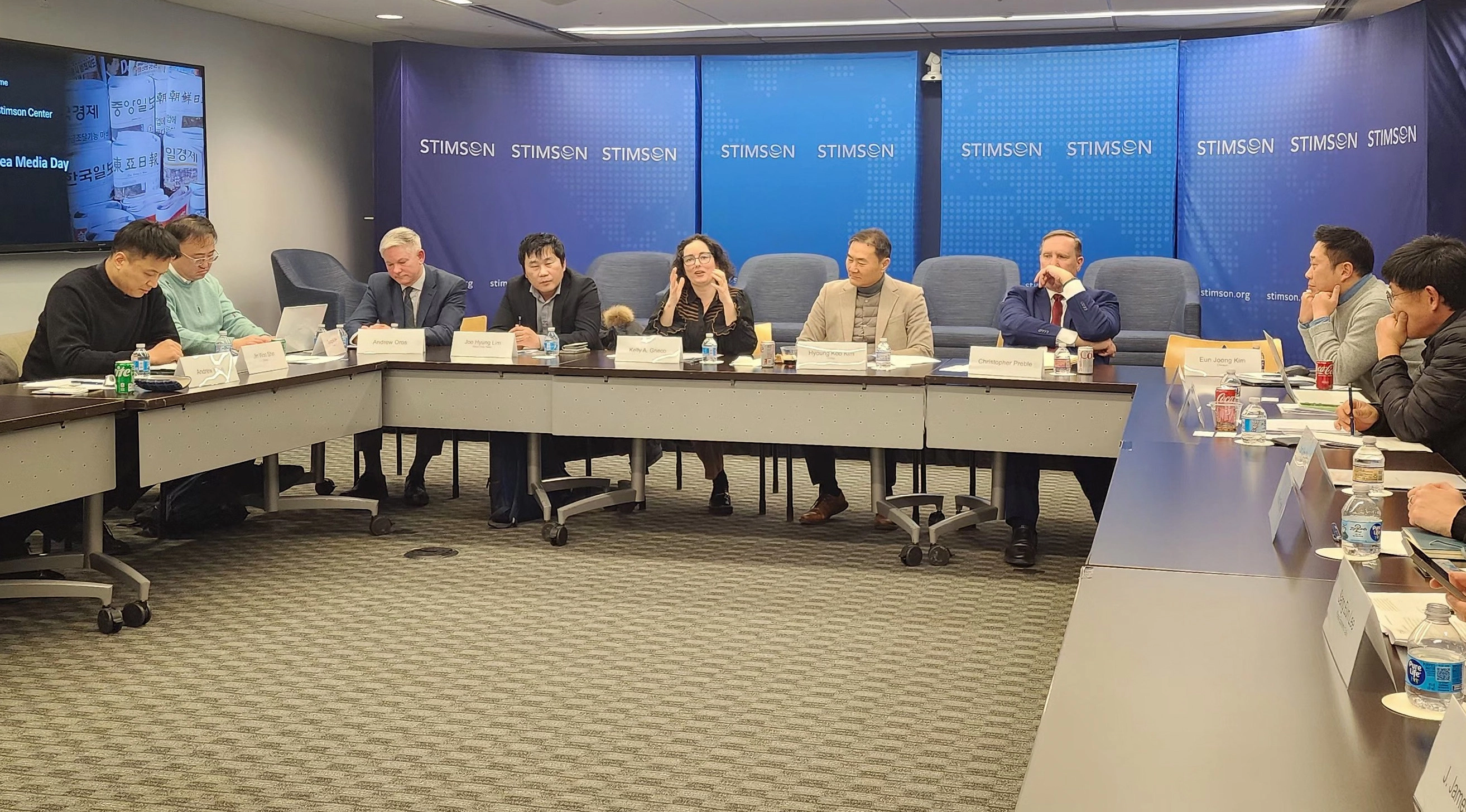 미국 싱크탱크 스팀슨센터 전문가들이 9일(현지시간) 워싱턴DC 사옥에서 한국 특파원들과 간담회를 하고 있다. 연합뉴스