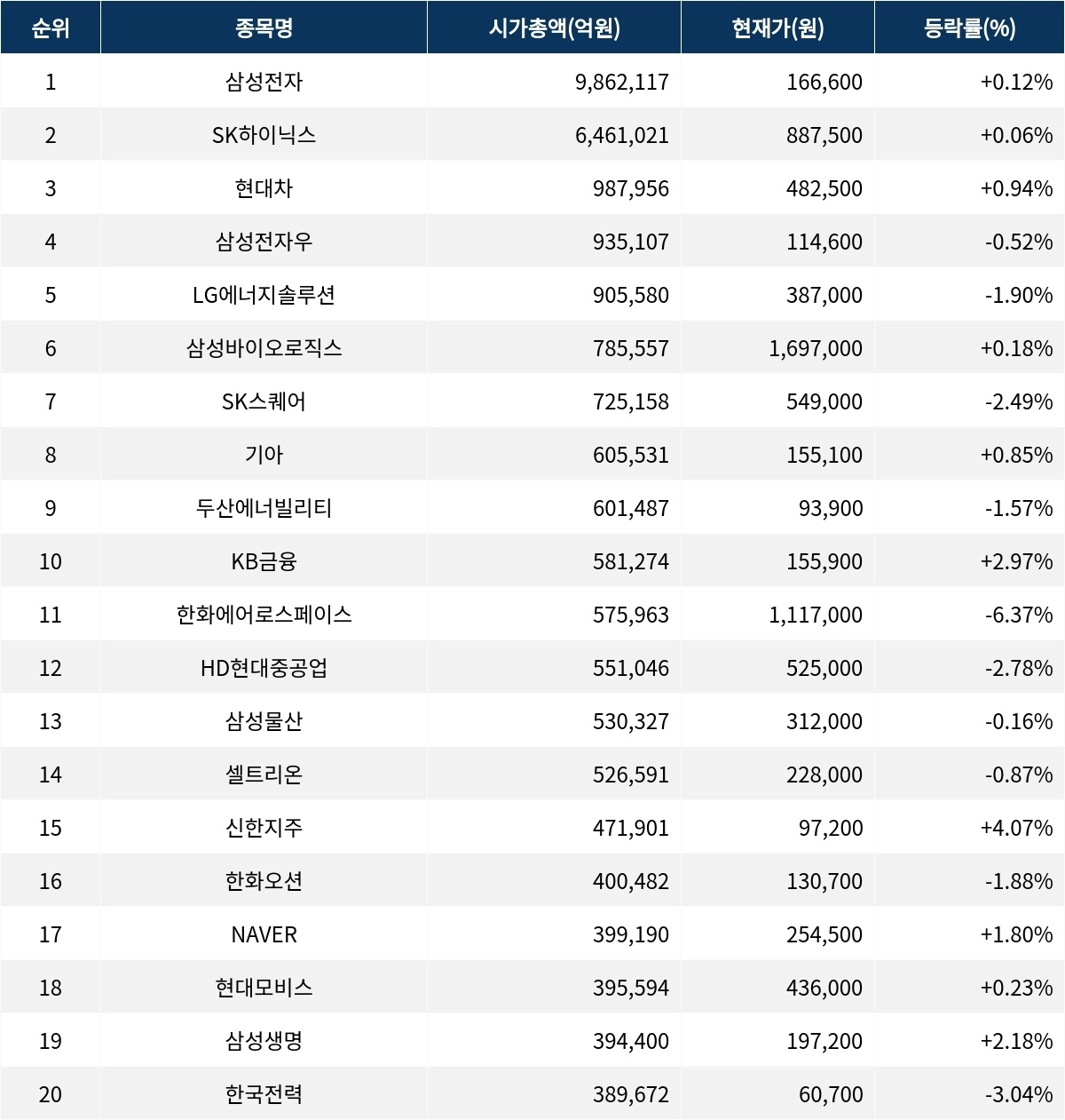 한편 시가총액 20위권 종목들은 한화에어로스페이스(012450) ▼6.37%, HD현대중공업(329180) ▼2.78%, 삼성물산(028260) ▼0.16%, 셀트리온(068270) ▼0.87%, 신한지주(055550) ▲4.07%, 한화오션(042660) ▼1.88%, NAVER(035420) ▲1.80%, 현대모비스(012330) ▲0.23%, 삼성생명(032830) ▲2.18%, 한국전력(015760) ▼3.04% 등의 성적을 기록하고 있다.