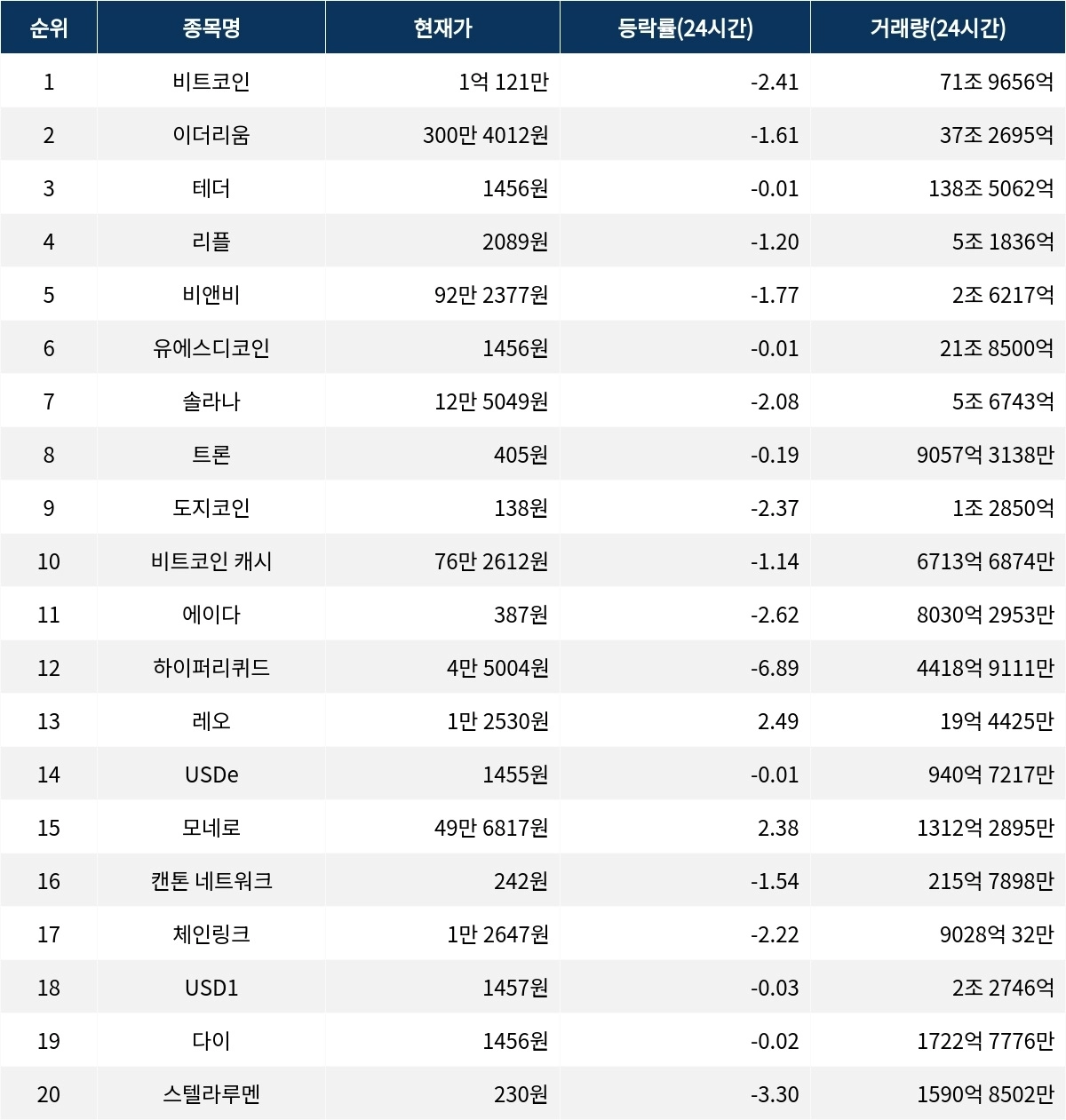 같은 시각 체인링크는 1만 2647원으로 2.22% 하락했다. 시가총액은 8조 9554억 원이다. USD1은 1457원으로 0.03% 하락했다. 시가총액은 7조 8206억 원이다. 다이는 1456원으로 0.02% 하락했다. 시가총액은 7조 8161억 원이다. 스텔라루멘은 230원으로 3.30% 하락했다. 시가총액은 7조 5305억 원이다.