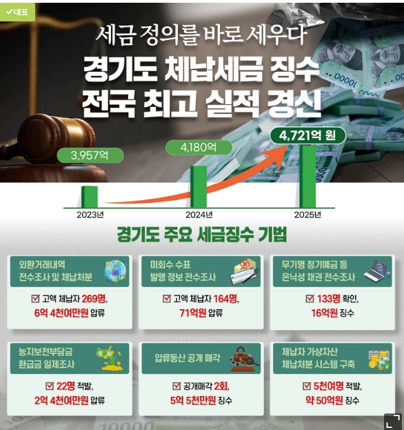 경기도 관계자는 “작년 고액 체납자 제로화 100일 작전을 추진하는 과정에서 세외수입 분야의 체납처분 제도가 미흡하다는 점을 확인했다”며 “금융정보 추적, 가산금 부과, 출국금지까지 이어지는 입체적 징수 체계를 구축해 고의적 체납과 재산 은닉, 해외 도피를 원천적으로 차단해 조세 정의를 실현해 나가겠다”고 밝혔다.