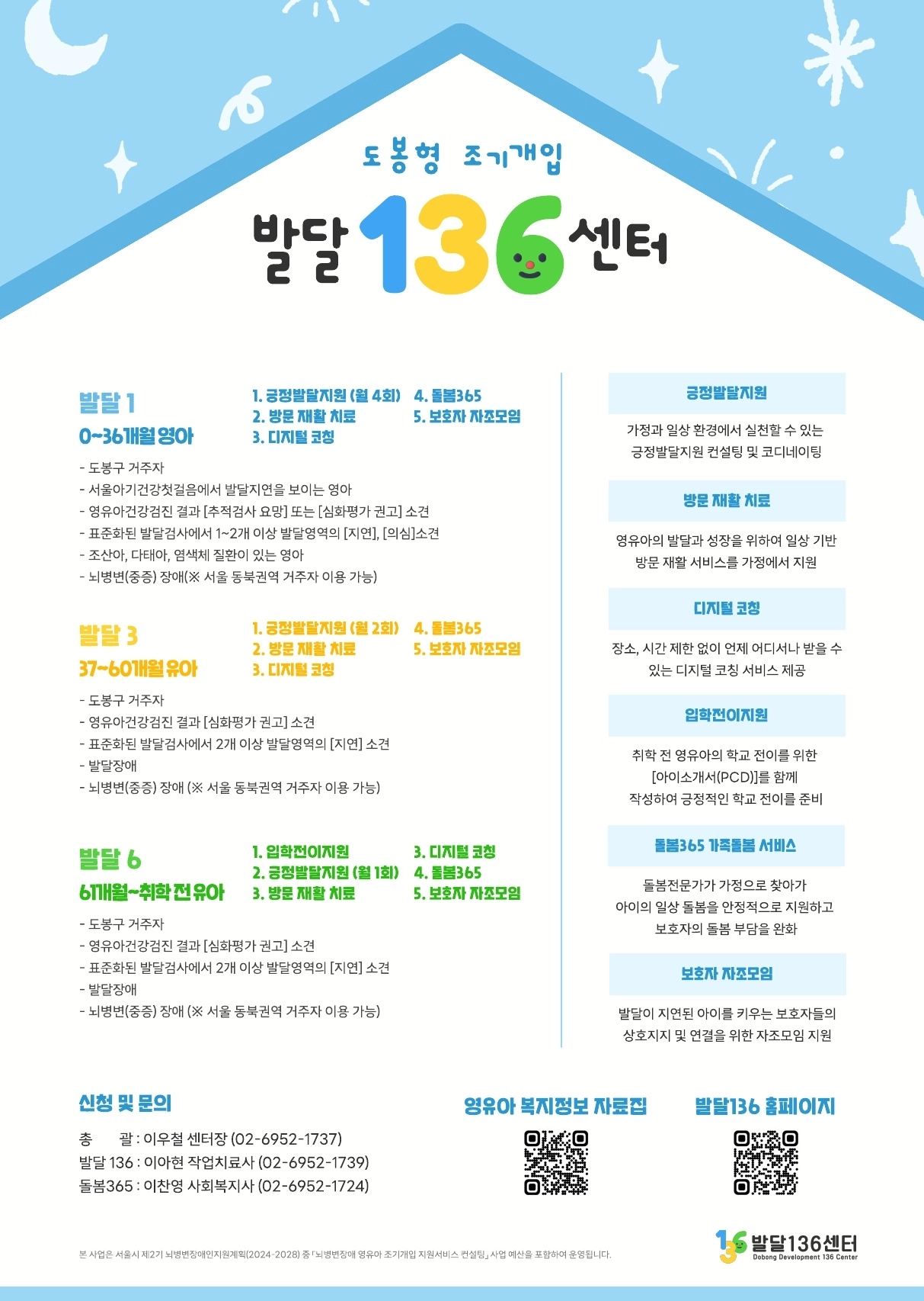 서울 도봉구는 미취학 영유아를 대상으로 생애주기 맞춤형 조기개입 ‘발달 136 사업’을 추진한다고 10일 밝혔다. 구가 지원하고 도봉장애인종합복지관이 시행하는 신규 사업으로, 발달이 느리거나 장애 위험이 있는 영유아를 조기에 발견해 성장 단계별 맞춤 지원을 연속적으로 제공하는 것이 목표다.