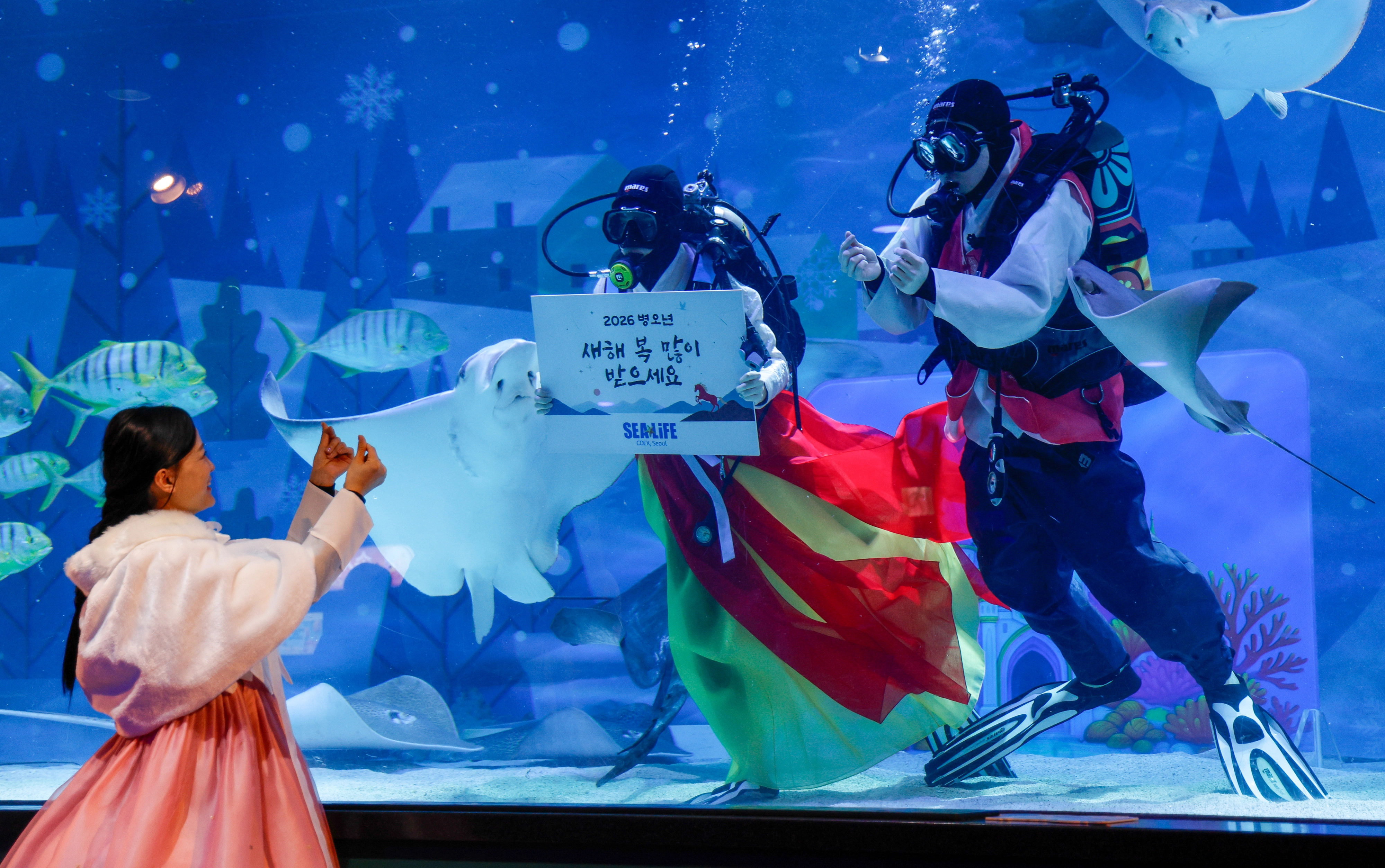 한복을 입은 스쿠버다이버들이 설 연휴를 앞둔 10일 오전 서울 강남구 씨라이프 코엑스 아쿠아리움에서 새해 인사를 전하고 있다. 뉴스1