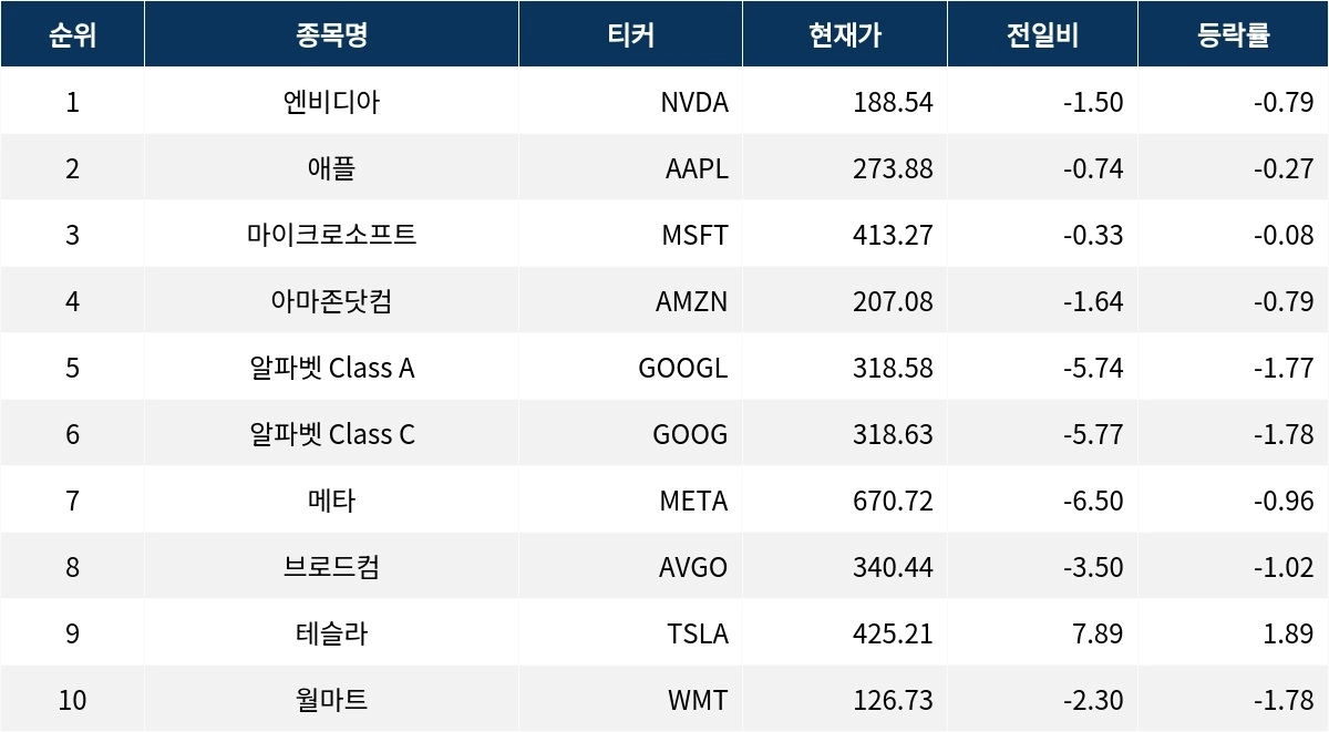 엔비디아는 188.54달러로 마감하며 전일 대비 0.79% 하락했다. 애플은 273.88달러로 0.27% 하락, 마이크로소프트는 413.27달러로 0.08% 하락하며 보합세를 유지했다.