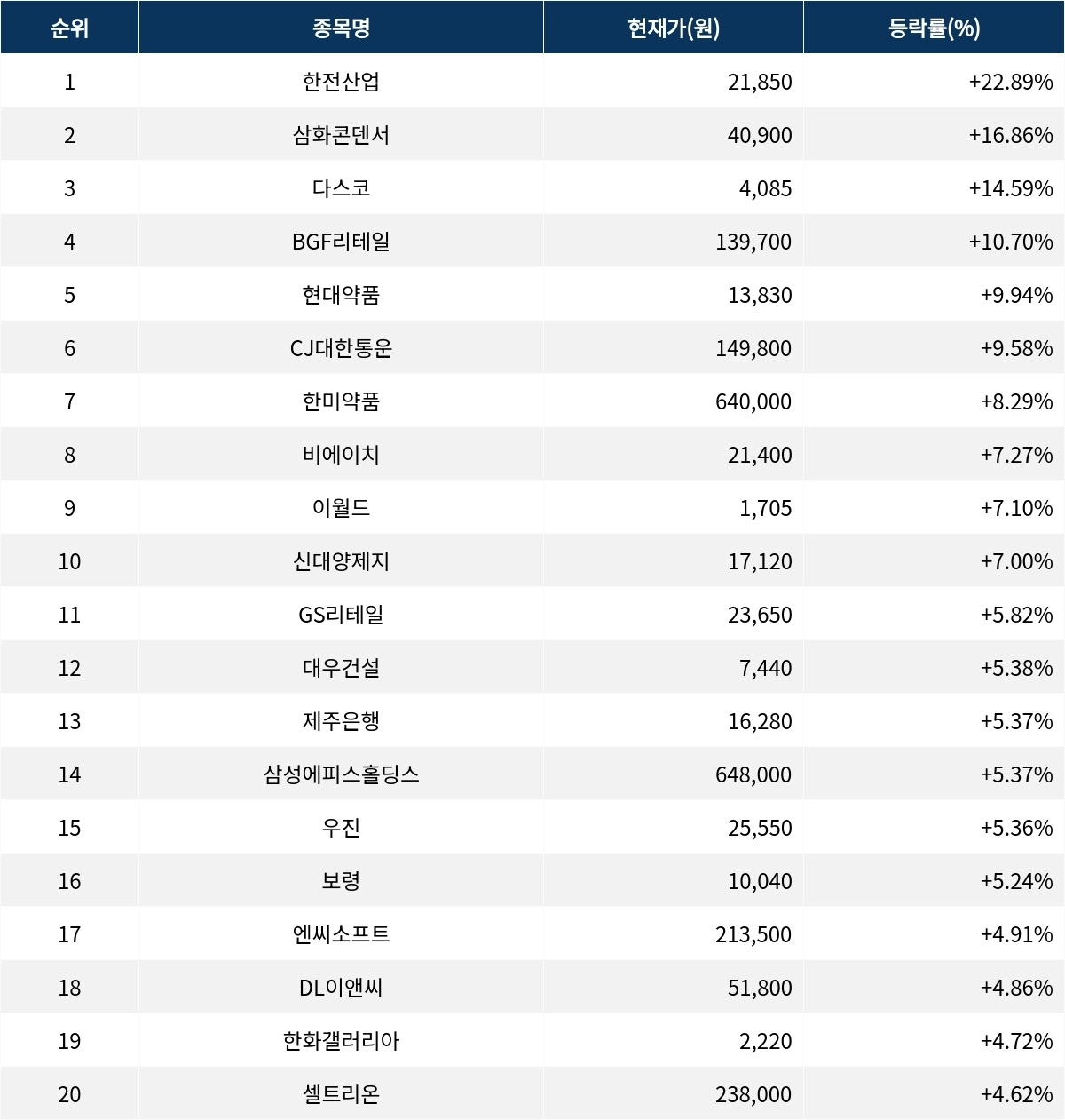 이어 상승률 2위 삼화콘덴서(001820)는 현재가 4만 900원으로 주가가 16.86% 급등하고 있다. 상승률 3위 다스코(058730)는 현재 4085원으로 14.59% 급등하며 강세를 보이고 있다. 상승률 4위 BGF리테일(282330)은 10.70% 상승하며 13만 9700원에 거래되고 있다. 상승률 5위 현대약품(004310)은 9.94%의 상승세를 타고 1만 3830원에 거래되고 있다.