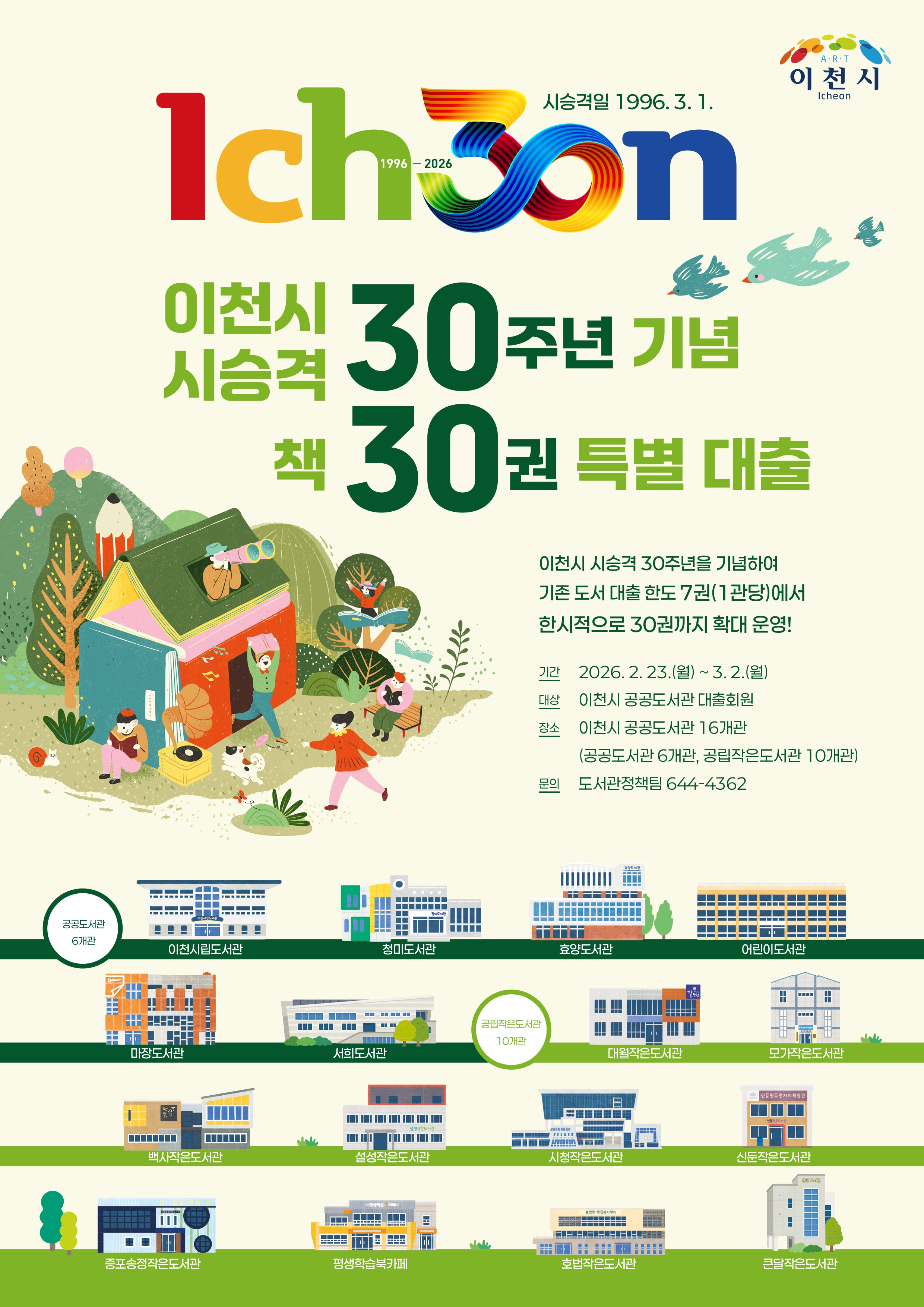 경기 이천시가 시 승격 30주년을 기념해 오는 23일부터 3월 2일까지 ‘책 30권 특별대출’ 서비스를 운영한다.