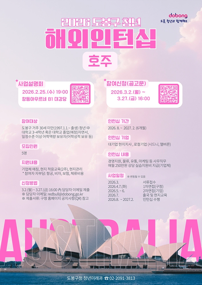 총 5명을 모집하며, 참여 기간은 오는 8월부터 2027년 2월까지 6개월이다. 선발자는 호주 현지 대기업 지사 또는 지역기업에서 인턴십을 수행한다. 대상은 도봉구에 거주하는 30세 미만 청년 가운데 대학 3·4학년 재학생 또는 졸업(예정)자다.