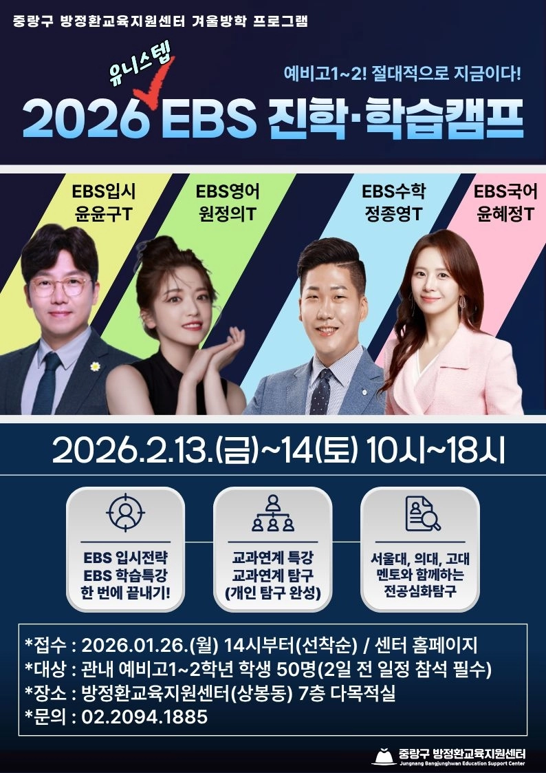 서울 중랑구 방정환교육지원센터는 겨울방학을 맞아 ‘2026 EBS 진학·학습 캠프’(포스터)를 운영한다고 11일 밝혔다. 오는 13일~14일에 예비 고등학교 1~2학년을 대상으로 진행한다.