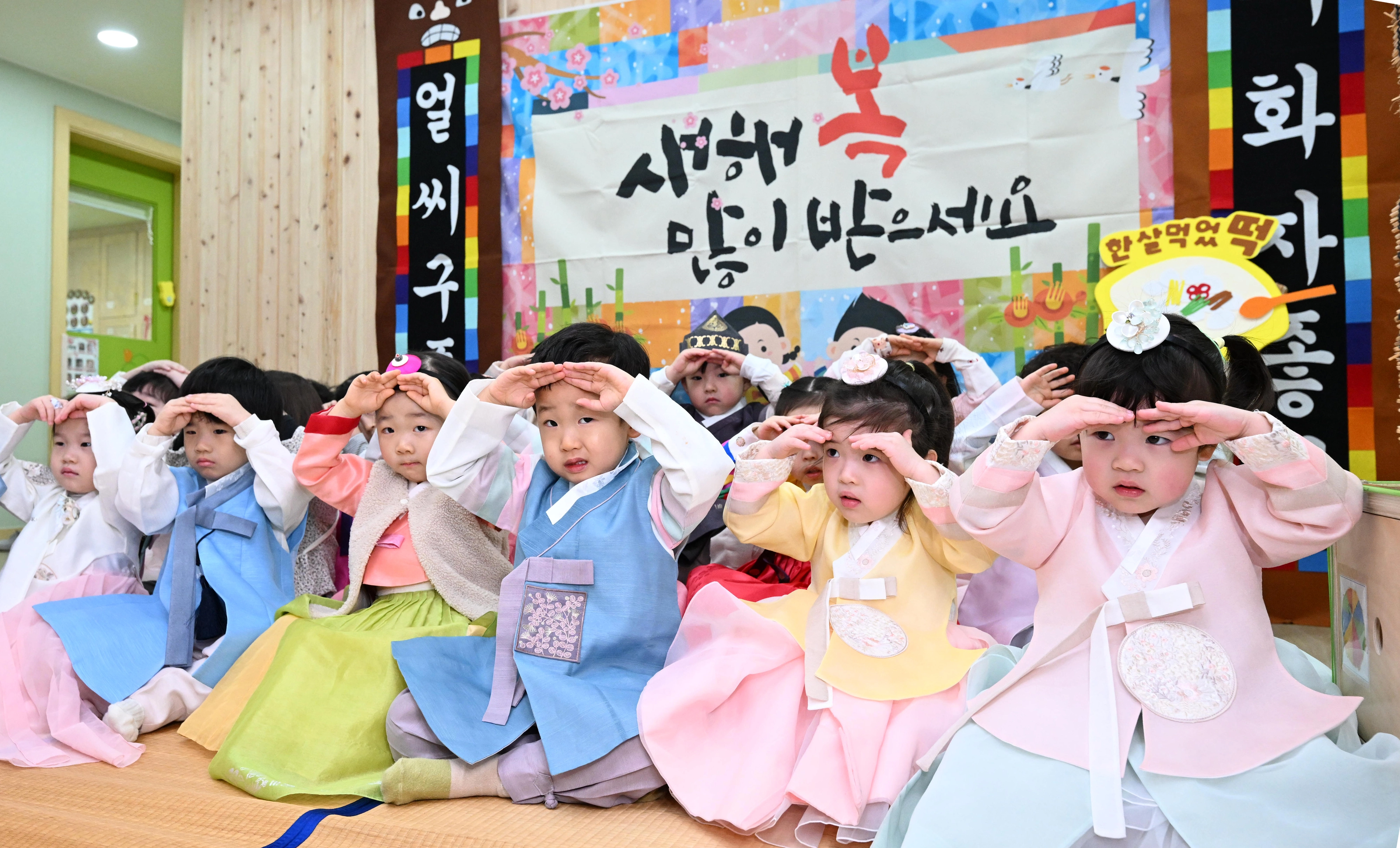 한복을 차려입은 원아들이 설 명절을 앞둔 11일 서울 송파구 삼성아트어린이집에서 세배하는 법을 배우고 있다.