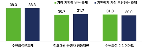 3대 가을 축제 중 수원화성문화제가 ‘가장 기억에 남는 축제’와 ‘지인에게 추천하고 싶은 축제’ 항목에서 1위를 차지했다.