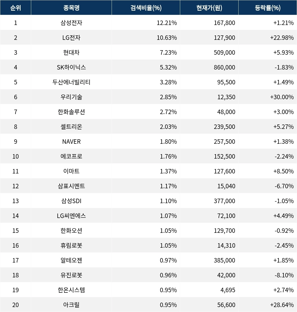 이어 검색비율 2위의 LG전자(066570)는 폭등률 22.98%로 상승 마감했다. 검색비율 3위의 현대차(005380)는 5.93% 상승 마감했다. 검색비율 4위 SK하이닉스(000660)는 하락률 1.83%로 하락했다. 검색비율 5위 두산에너빌리티(034020)는 1.49% 상승하며 강보합으로 마감했다.