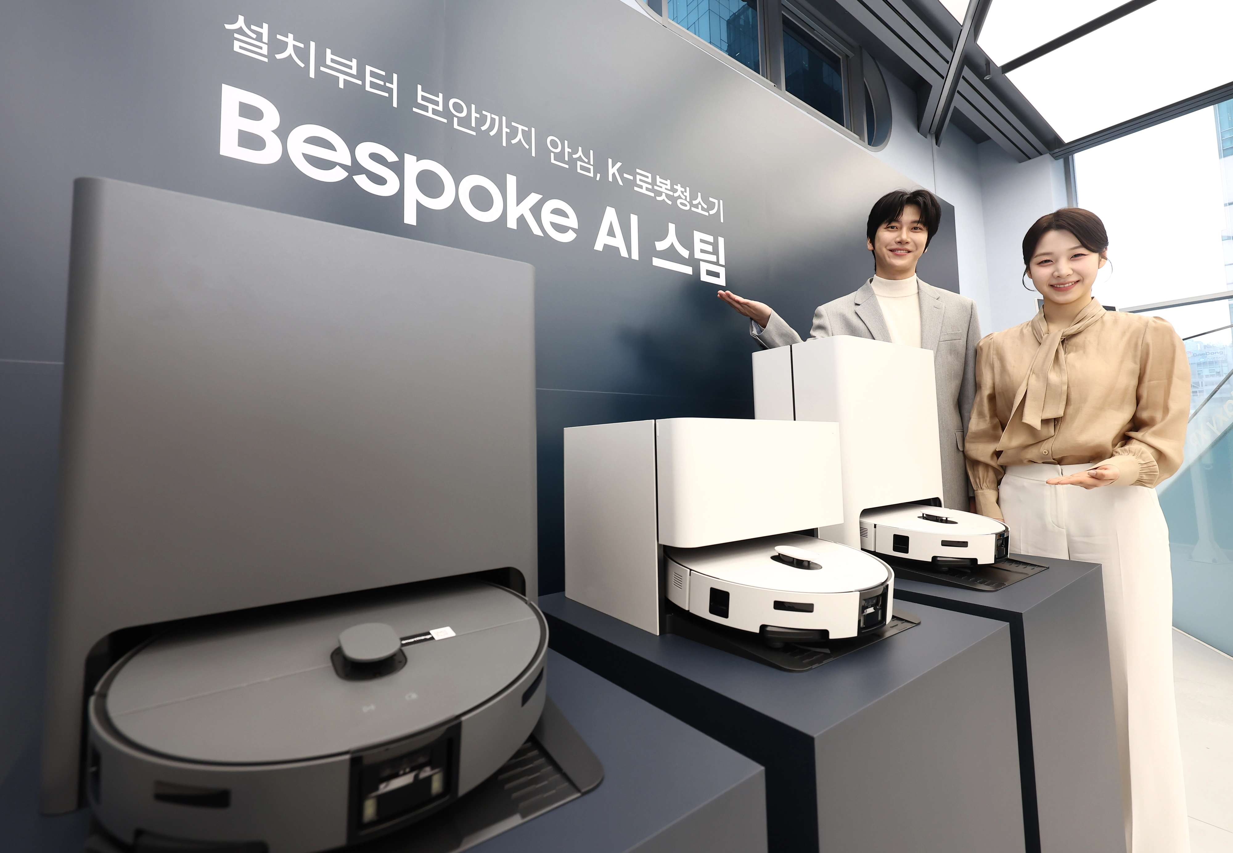 삼성전자 모델들이 11일 서울 강남구 ‘삼성 강남’에서 열린 ‘로봇청소기 신제품 미디어 브리핑’에서 2026년형 ‘비스포크 인공지능(AI) 스팀’ 로봇청소기를 소개하고 있다. 신제품에는 투명한 액체까지 인식하는 ‘AI 액체인식’ 및 45㎜ 높이의 문턱을 넘을 수 있는 ‘이지패스 휠’ 기능 등이 새롭게 도입됐다. 삼성전자 제공