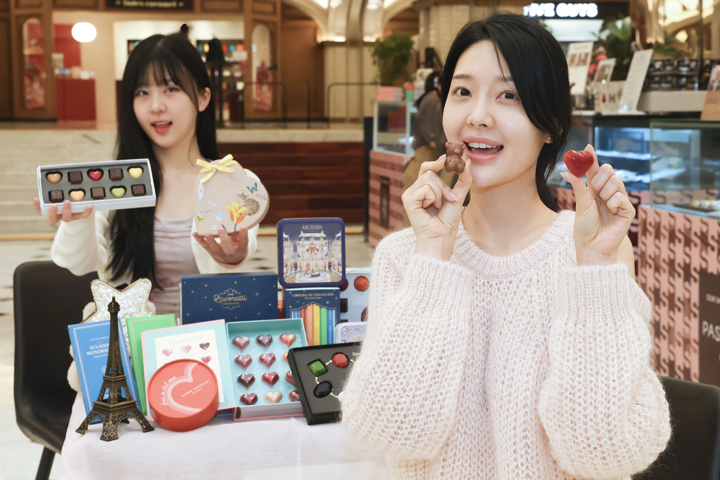 신세계백화점 모델들이 11일 서울 서초구 신세계백화점 강남점 지하 1층 스위트파크에서 초콜릿 선물세트를 선보이고 있다. 신세계백화점은 밸런타인데이를 맞아 이날부터 14일까지 다양한 초콜릿 디저트를 판매한다. 신세계백화점 제공