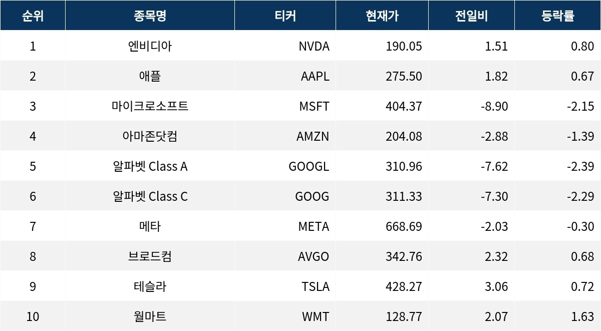 엔비디아(NVDA)는 0.80% 상승한 190.05달러로 마감했다. 애플(AAPL)은 0.67% 오른 275.50달러를 기록했다. 반면, 마이크로소프트(MSFT)는 2.15% 하락해 404.37달러로 거래를 마쳤다.