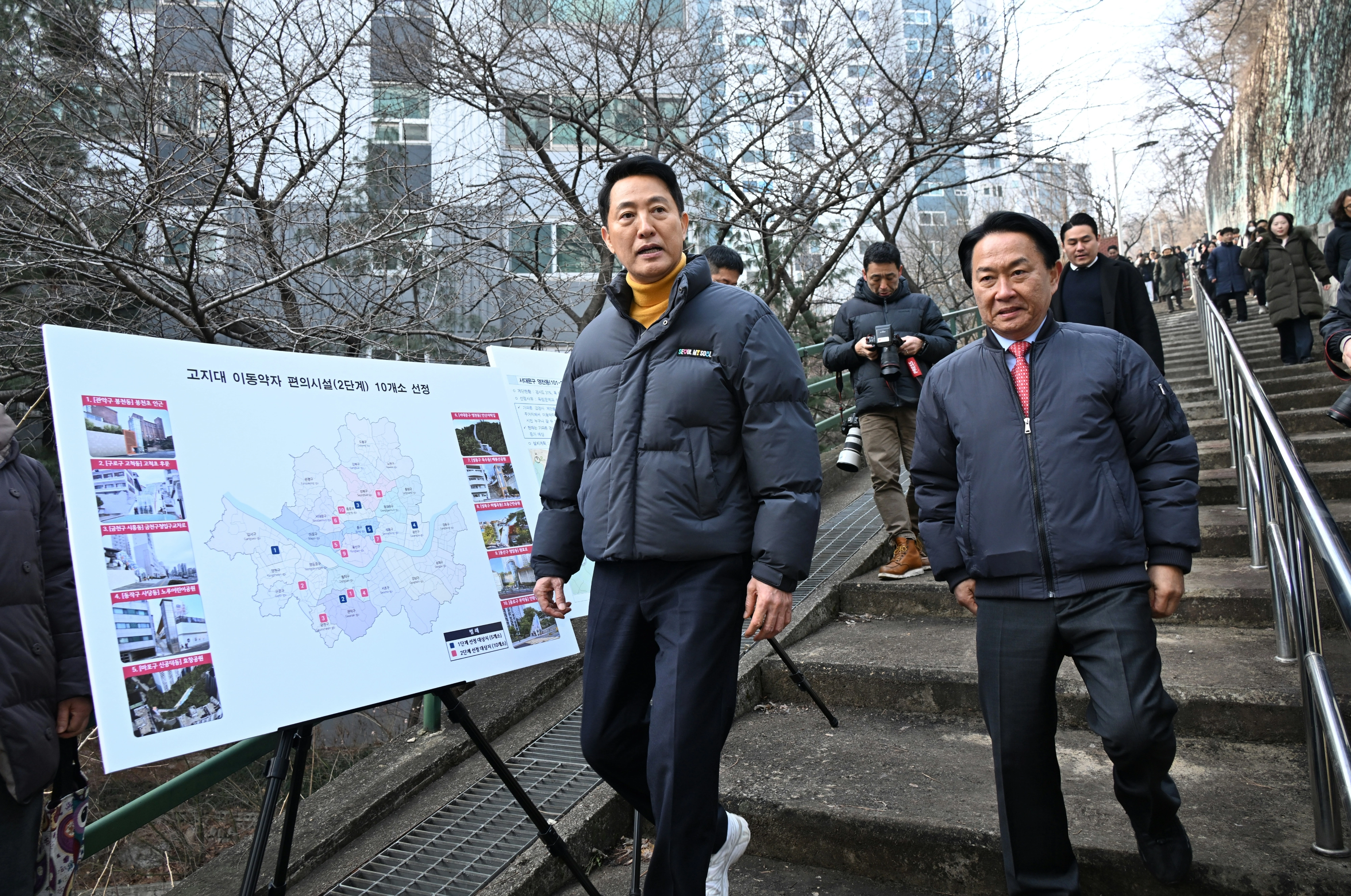오세훈 서울시장은 12일 서대문구 영천동 독립문삼호아파트 앞 가파른 계단에서 주민들을 만나 선정 결과를 발표했다. 오 시장은 “가파른 산자락 길을 올라가기 어려운 어르신들이 계속해서 건강관리를 할 수 있도록 이동 약자 편의시설 10곳을 추가한다”고 말했다.
