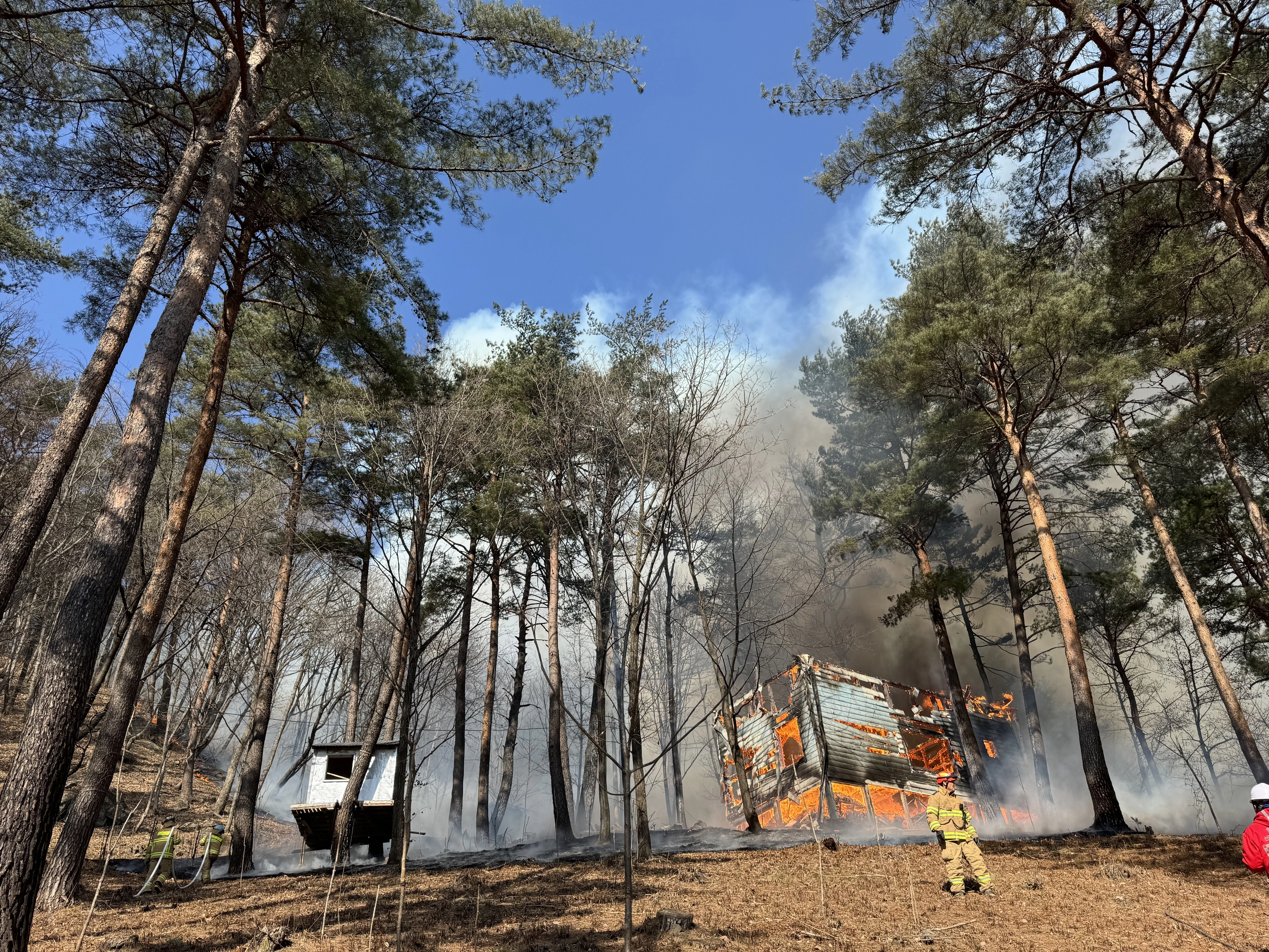 강원소방본부는 이날 오전 10시 18분쯤 장리에 있는 한 농막에서 불이 났다 밝혔다. 불은 초속 4~5m의 강한 바람을 타고 인근 산림으로 번졌다.