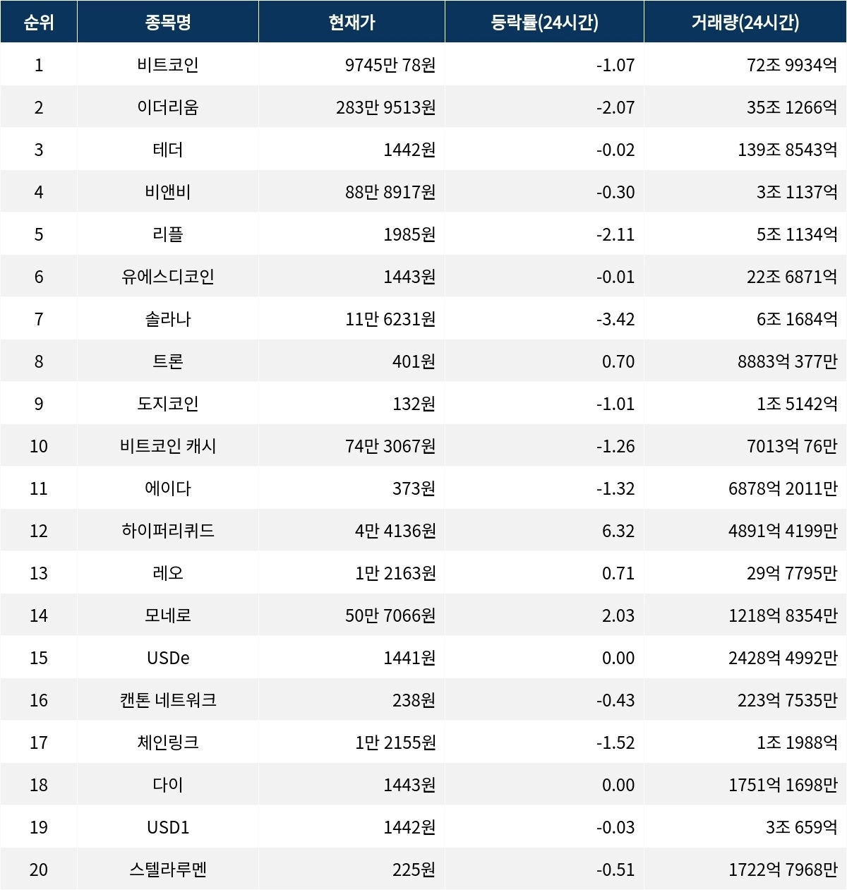 USD1은 1,442원으로 -0.03% 하락했다. 거래량은 3조 659억 원이다. 스텔라루멘(XLM)은 225원으로 -0.51% 하락하며 거래량은 1,722억 7,968만 원이다.