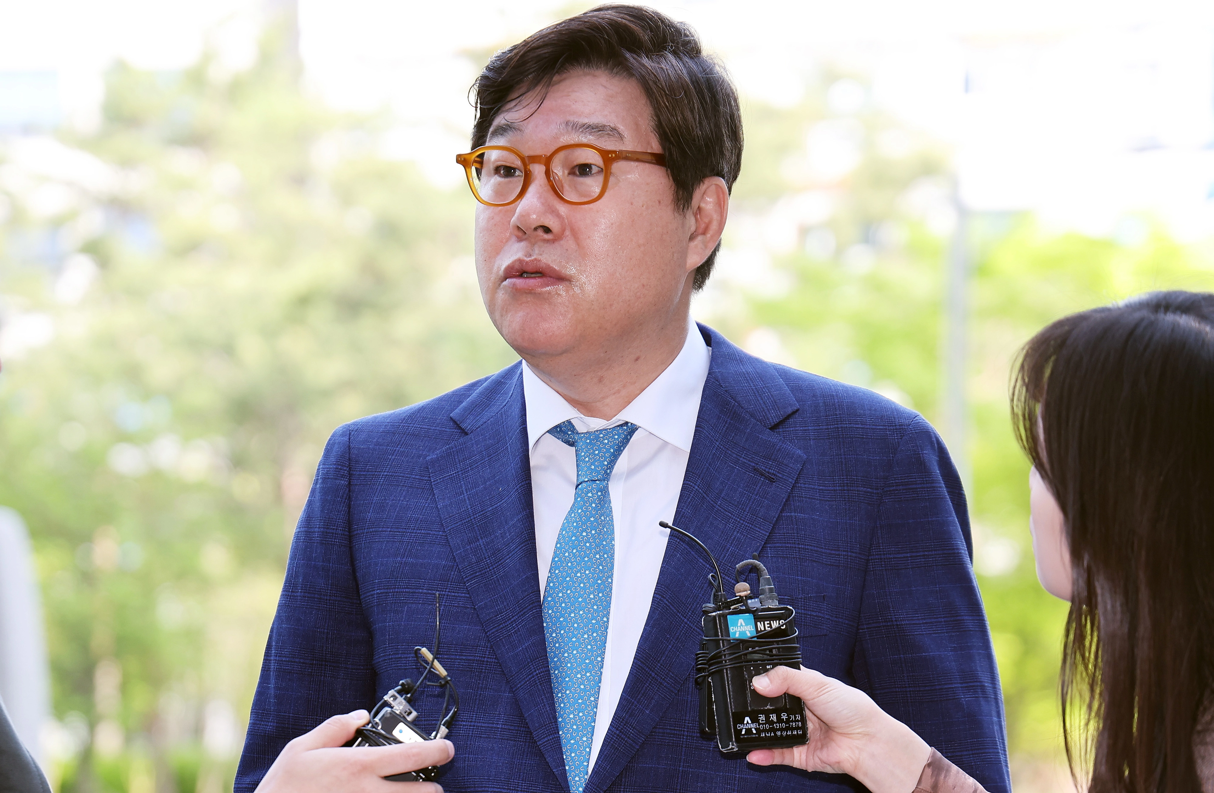 5개 비상장회사 자금 500억원대 횡령 및 800만 달러 대북송금 혐의 등으로 기소된 김성태 쌍방울 그룹 전 회장이 19일 오전 경기도 수원시 영통구 수원지방법원에서 열린 공판에 출석하며 취재진 질문에 답하고 있다. 2024.4.19 연합뉴스