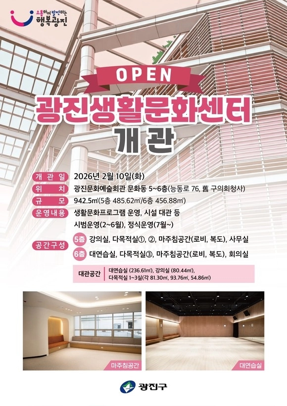 김경호 구청장은 “광진생활문화센터는 주민이 일상에서 문화예술을 배우고 즐기며 서로 소통할 수 있는 참여형 복합 문화 공간”이라며 “앞으로도 공간 운영과 프로그램을 지속적으로 보완해 지역 문화의 저변을 넓히는 거점으로 발전시켜 나가겠다”고 말했다.