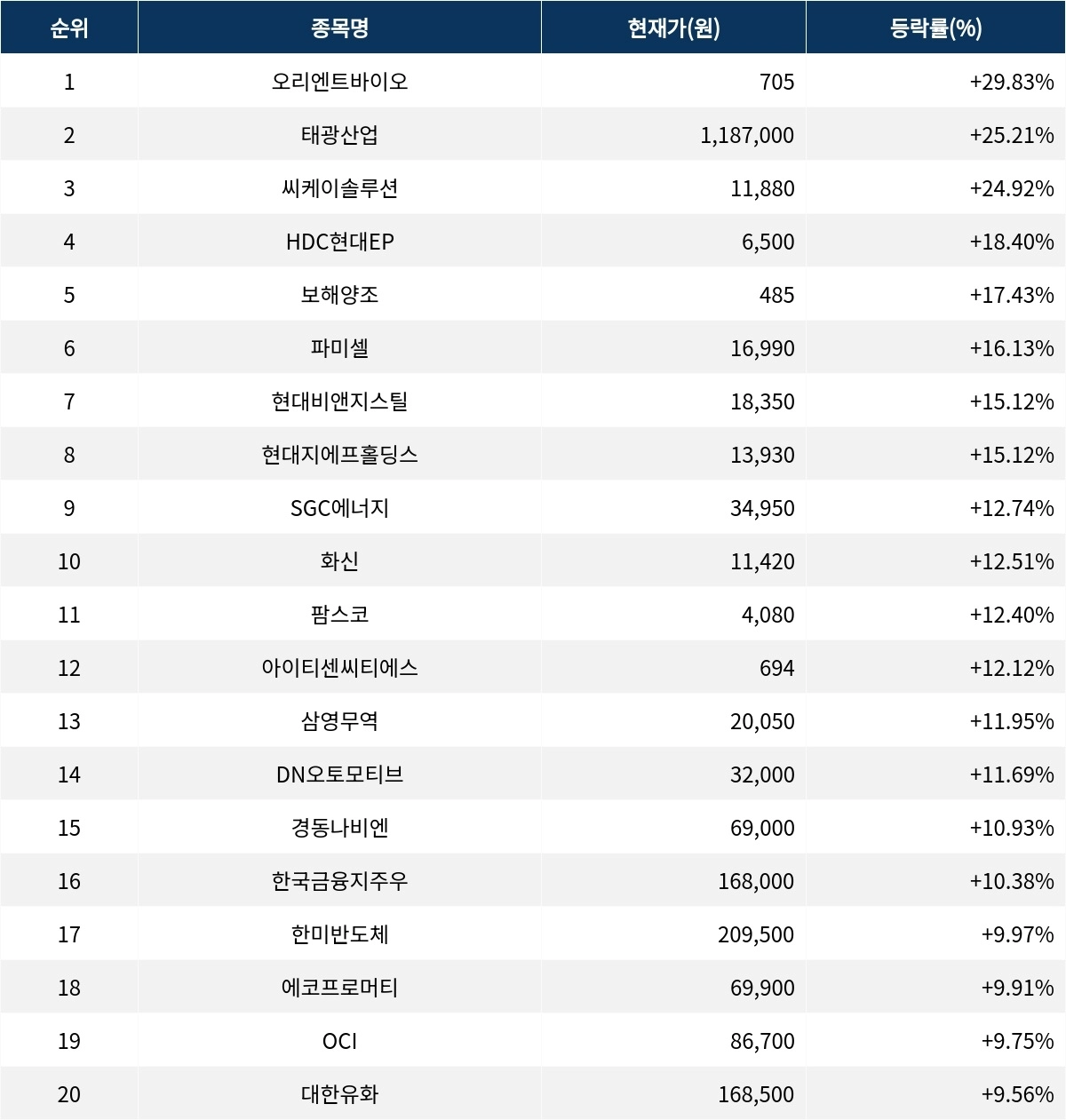 6위 파미셀(005690)은 종가 16,990원으로 16.13% 급등 마감했다. 7위 현대비앤지스틸(004560)은 종가 18,350원으로 15.12% 급등 마감했다. 8위 현대지에프홀딩스(005440)는 종가 13,930원으로 15.12% 급등 마감했다. 9위 SGC에너지(005090)는 종가 34,950원으로 12.74% 급등 마감했다. 10위 화신(010690)은 종가 11,420원으로 12.51% 급등 마감했다.