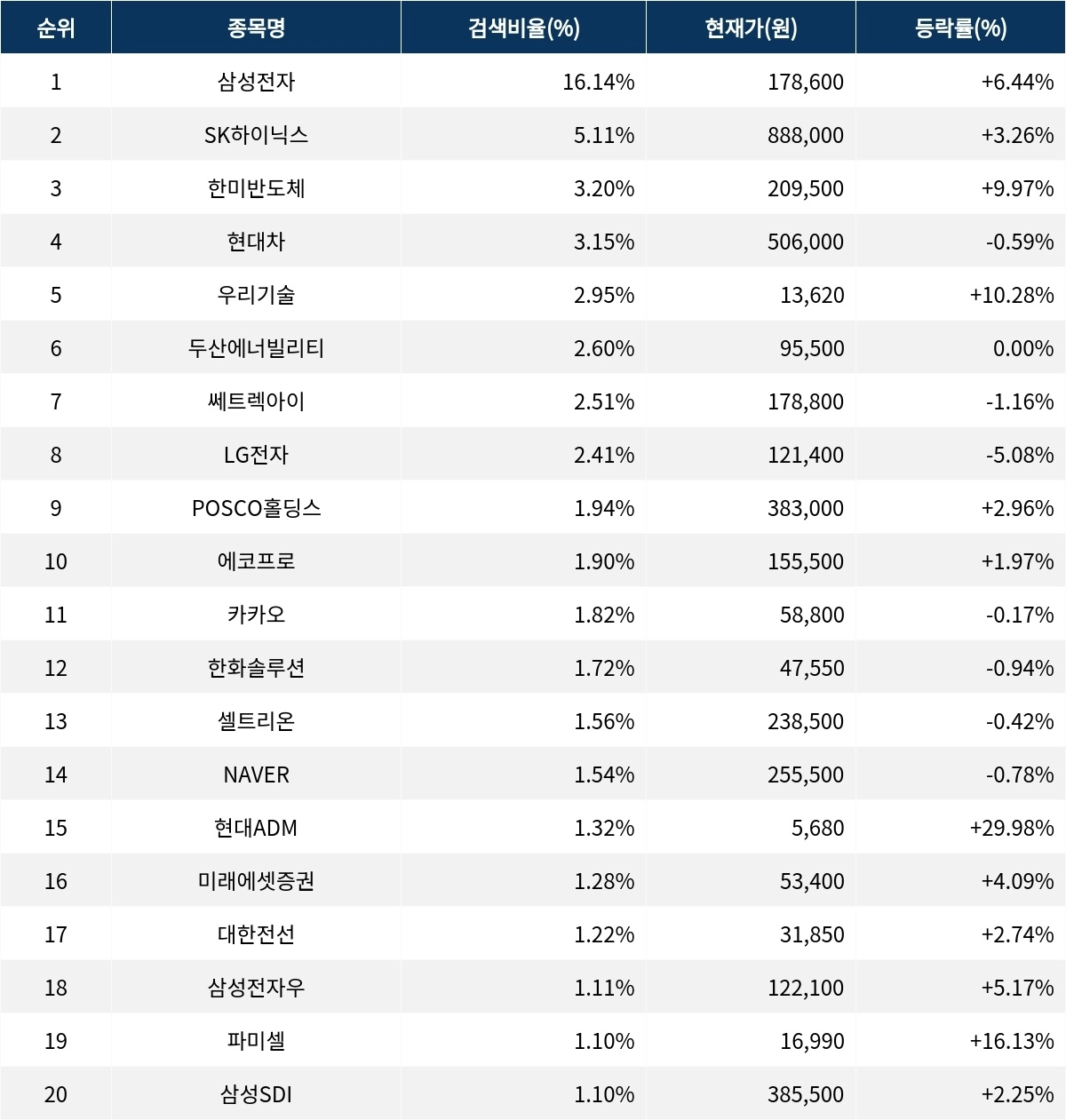 이어 검색비율 2위의 SK하이닉스(000660)는 등락률 3.26%로 상승 마감했다. 검색비율 3위의 한미반도체(042700)는 9.97% 상승 마감했다. 검색비율 4위 현대차(005380)는 등락률 -0.59%로 횡보했다. 검색비율 5위 우리기술(032820)은 10.28% 상승하며 강세로 마감했다.