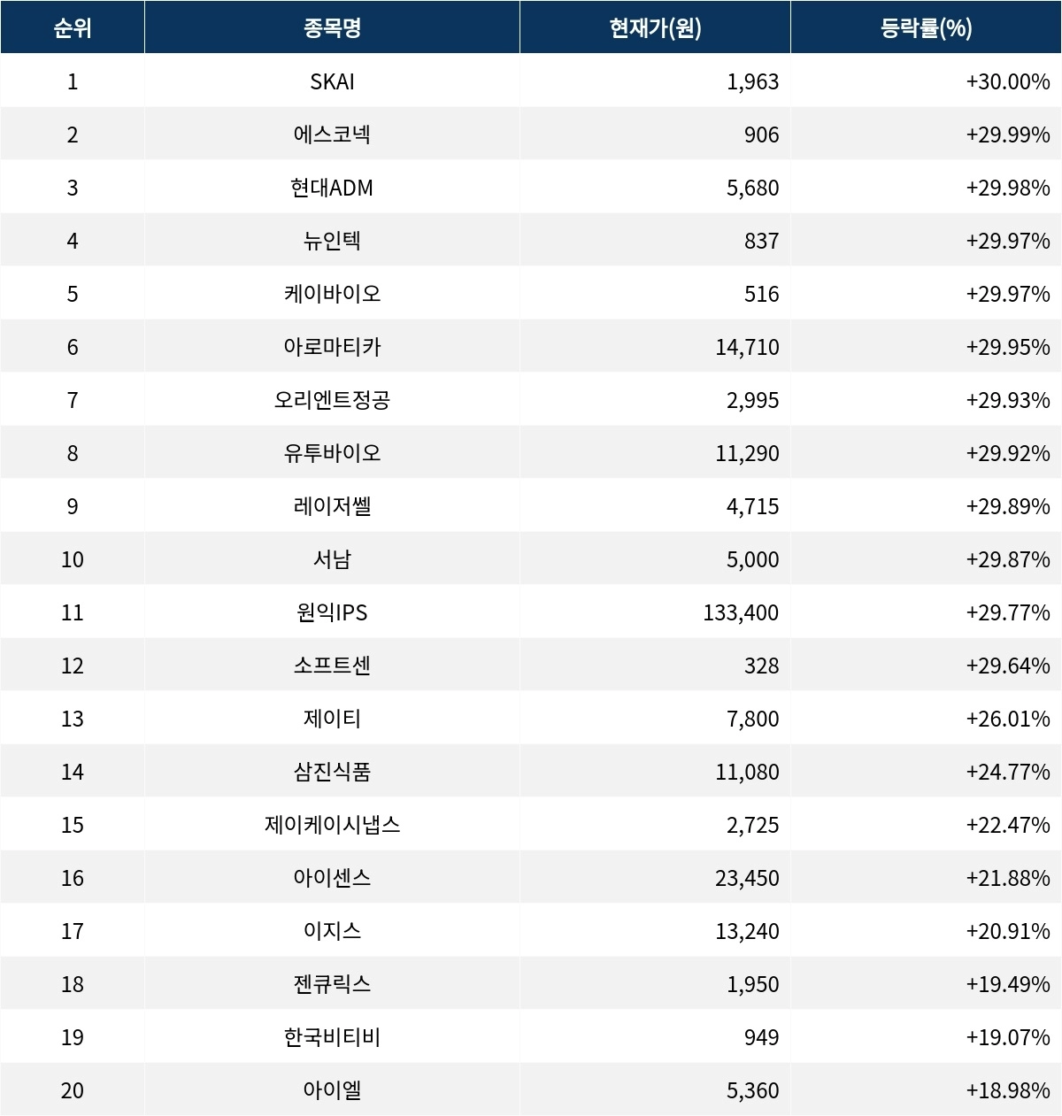 이어 상승률 2위 에스코넥(096630)은 주가가 +29.99% 폭등하며 종가 906원에 상승 마감했다. 상승률 3위 현대ADM(187660)의 주가는 5,680원으로 +29.98% 폭등하며 강세를 보였다. 상승률 4위 뉴인텍(012340)은 +29.97% 상승하며 837원에 마감했다. 상승률 5위 케이바이오(038530)는 +29.97%의 상승세를 타고 종가 516원에 마감했다.