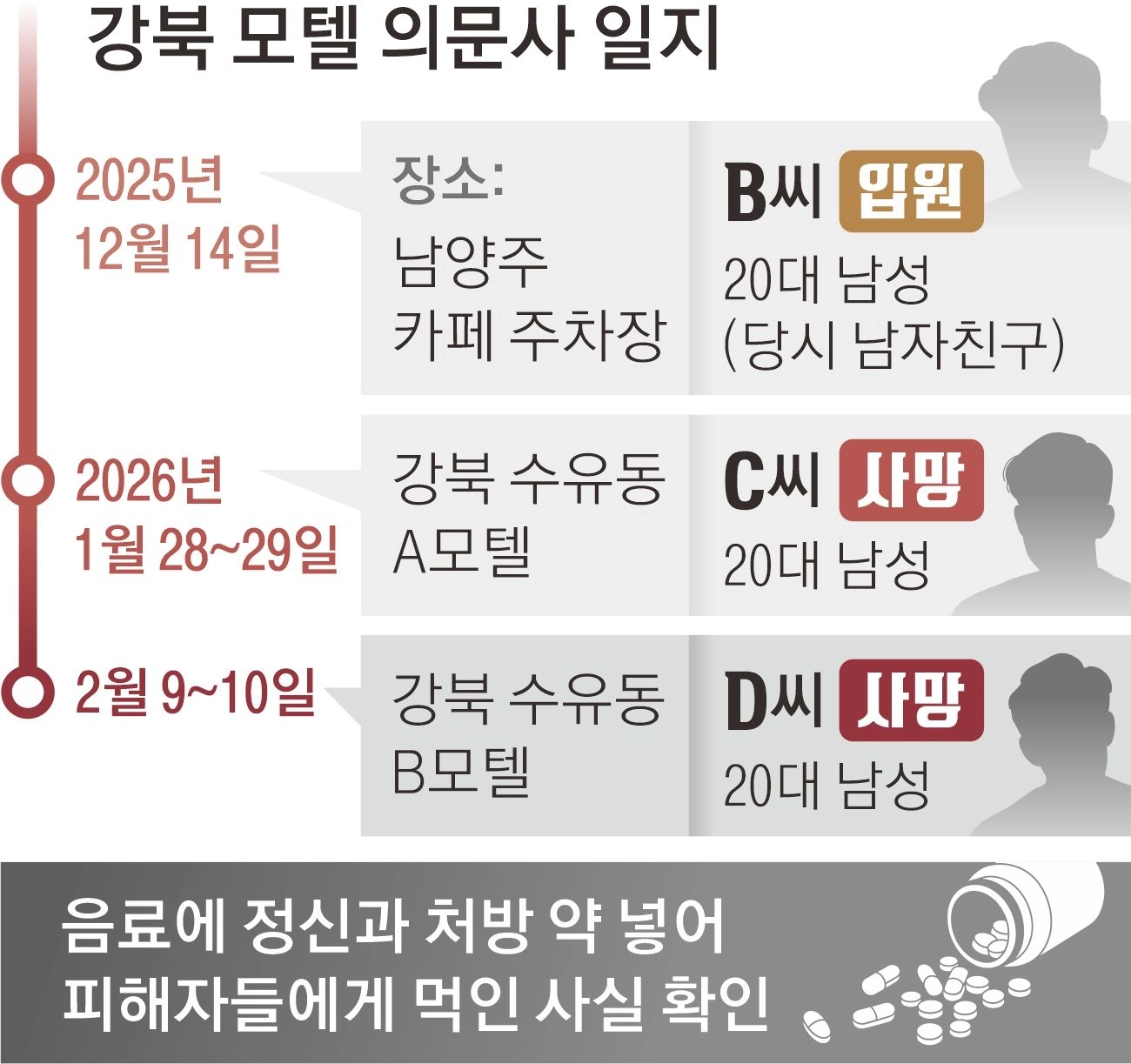 서울 강북구 일대 숙박업소에서 발생한 ‘남성 연쇄 사망 사건’의 피의자인 20대 여성 A씨가 구속됐다. 숙취해소제 등에 정신과 처방 약물을 섞어 건네는 수법으로 20대 남성 2명이 숨진 가운데 A씨가 범행을 거듭하며 약물 투여량을 늘린 정황이 드러났다. A씨의 과거 남자친구 역시 같은 방식으로 약물이 든 음료를 건네받아 의식을 잃었던 것으로 파악되면서 추가 피해 가능성에 대한 우려도 커지고 있다.