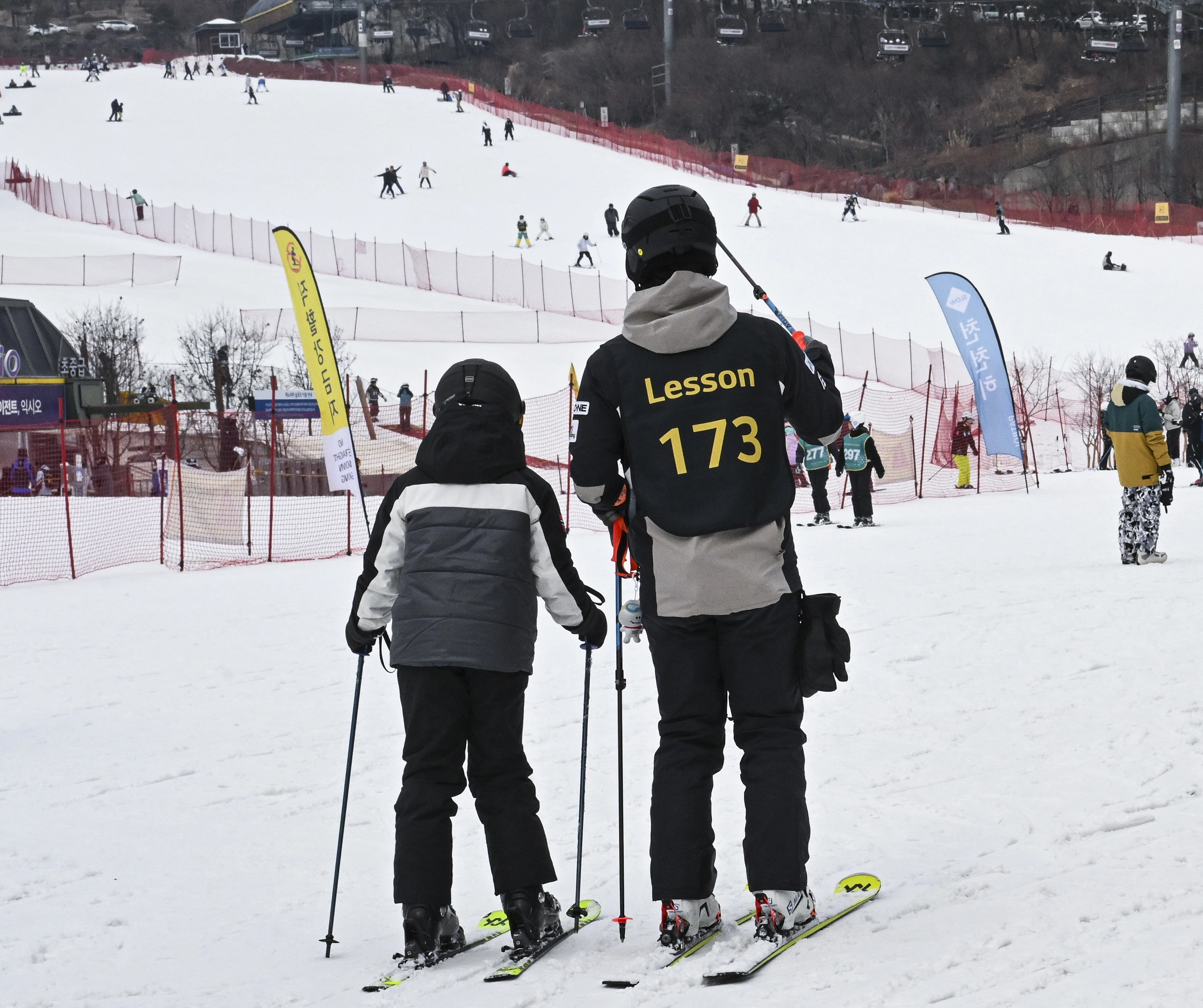 스키 강사와 수강생이 나란히 서서 걷는 연습을 하고 있습니다. 누구에게나 처음은 있기 마련입니다. 천천히 한 걸음씩 내딛다 보면 저 위의 스키어들처럼 드넓은 설원을 활강할 수 있게 됩니다. 중요한 것은 넘어져도 다시 일어나는 꾸준한 노력입니다. 이지훈 기자