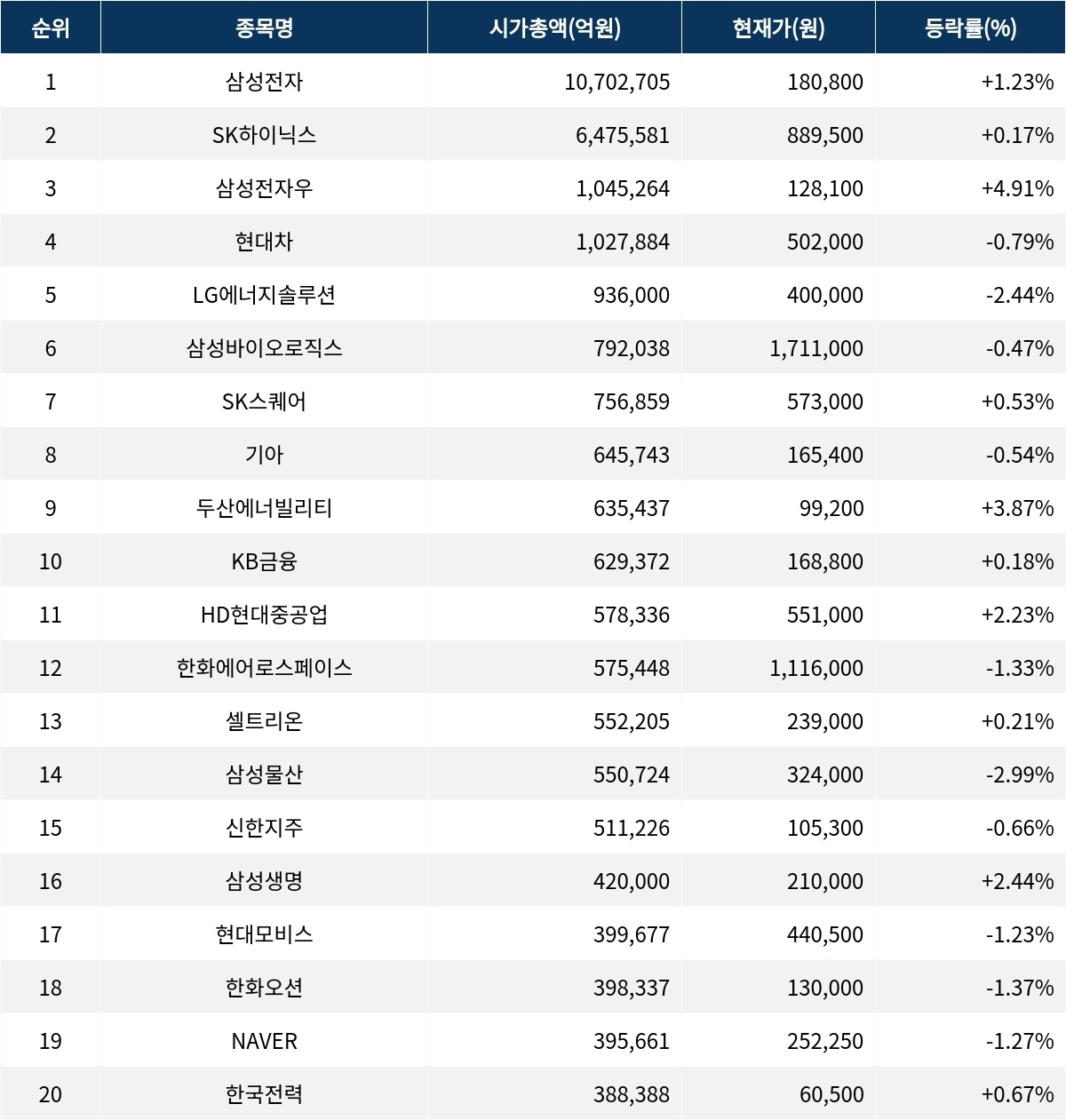 한편 시가총액 20위권 종목들은 HD현대중공업(329180) ▲2.23%, 한화에어로스페이스(012450) ▼1.33%, 셀트리온(068270) ▲0.21%, 삼성물산(028260) ▼2.99%, 신한지주(055550) ▼0.66%, 삼성생명(032830) ▲2.44%, 현대모비스(012330) ▼1.23%, 한화오션(042660) ▼1.37%, NAVER(035420) ▼1.27%, 한국전력(015760) ▲0.67% 등의 성적을 기록하고 있다.