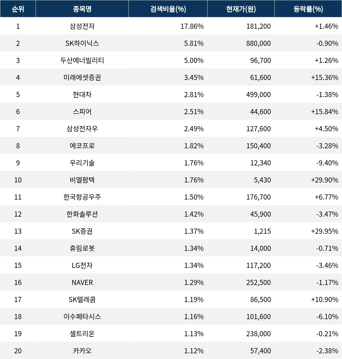이어 검색비율 2위의 SK하이닉스(000660)는 등락률 -0.90%로 하락 마감했다. 검색비율 3위의 두산에너빌리티(034020)는 1.26% 상승 마감했다. 검색비율 4위 미래에셋증권(006800)은 15.36%의 급등세로 마감했다. 검색비율 5위 현대차(005380)는 -1.38%의 등락률로 하락했다.