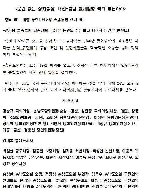 이들은 결의문을 통해 “통합을 내걸었지만, 한시적 교부세 편파 지원으로 오히려 지방을 서로 갈라치기 하는 ‘양두구육’식 졸속 통합을 단호히 반대한다”며 “기초부터 부실하게 설계된 6·3 선거용인 ‘무늬만 통합’은 충남과 대전의 기존 경쟁력마저 훼손한다”고 밝혔다.