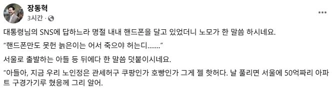 장 대표는 18일 페이스북에 어머니의 말을 직접 옮겨 “아들아, 날 풀리면 서울에 50억짜리 아파트 구경가기루 혔응께 그리 알어”라는 내용의 글을 올렸다. ‘50억짜리 아파트는 구경이나 가는 곳’이라는 노모의 말을 통해 정작 퇴임 후 50억원대 시세 차익이 예상되는 재건축 아파트를 보유한 이 대통령을 겨냥했다는 해석이다.