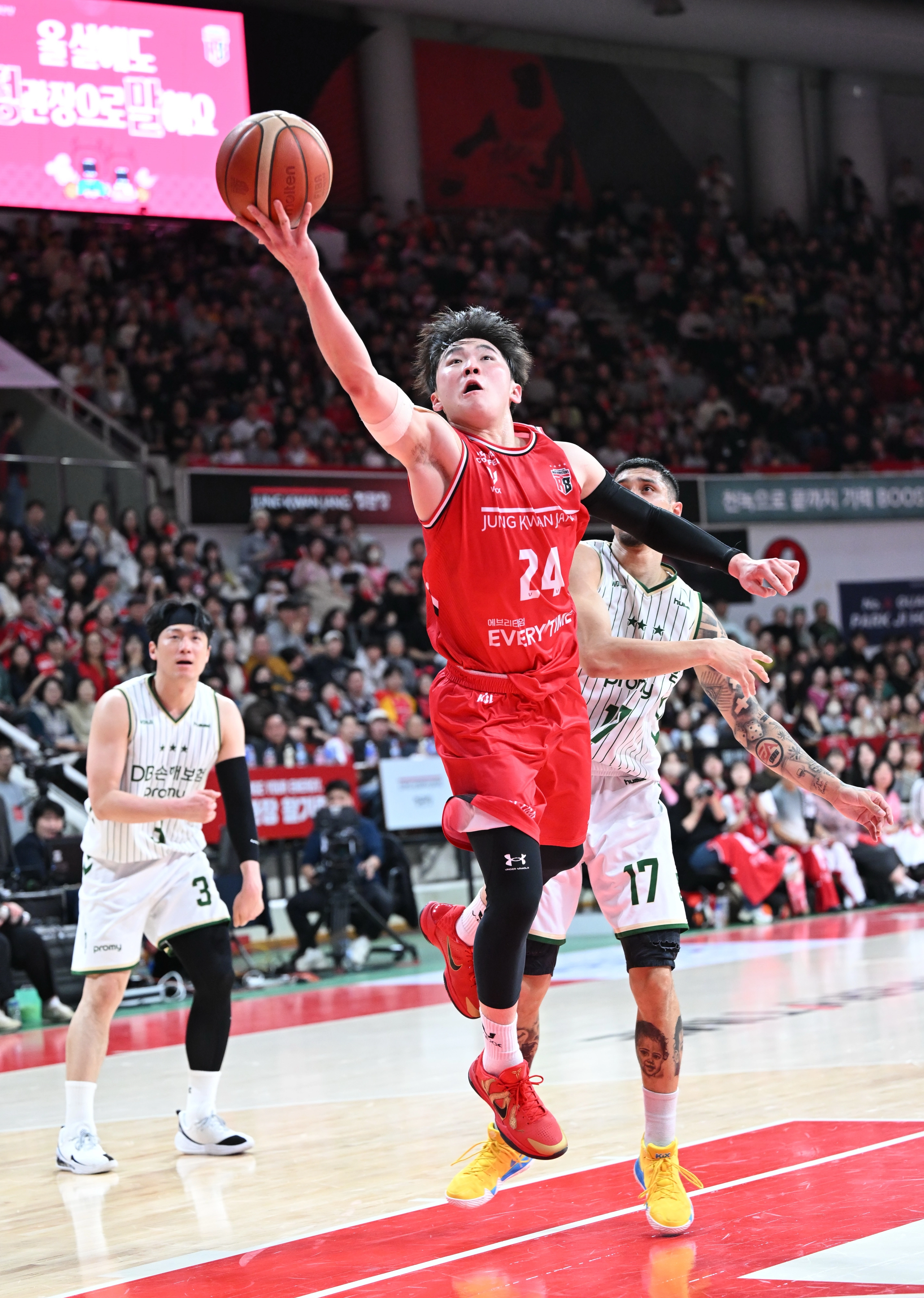 3쿼터들어서도 양상은 바뀌지 않았다. 종료 2분32초전 문유현의 3점슛으로 63-43으로 20점차까지 달아난 정관장은 4쿼터에서도 문유현, 한승희의 외곽포가 거침없이 터지며 75-47로 점수차를 벌렸다. 정관장은 4쿼터 종료 1분37초를 남기고 소준혁의 3점포까지 터지며 87-57, 30점차까지 앞서나가며 사실상 승부를 결정지었다. DB는 점수차가 벌어지면서 4쿼터 시작과 동시에 알바노를 벤치로 불러들이며 백기를 들었다.