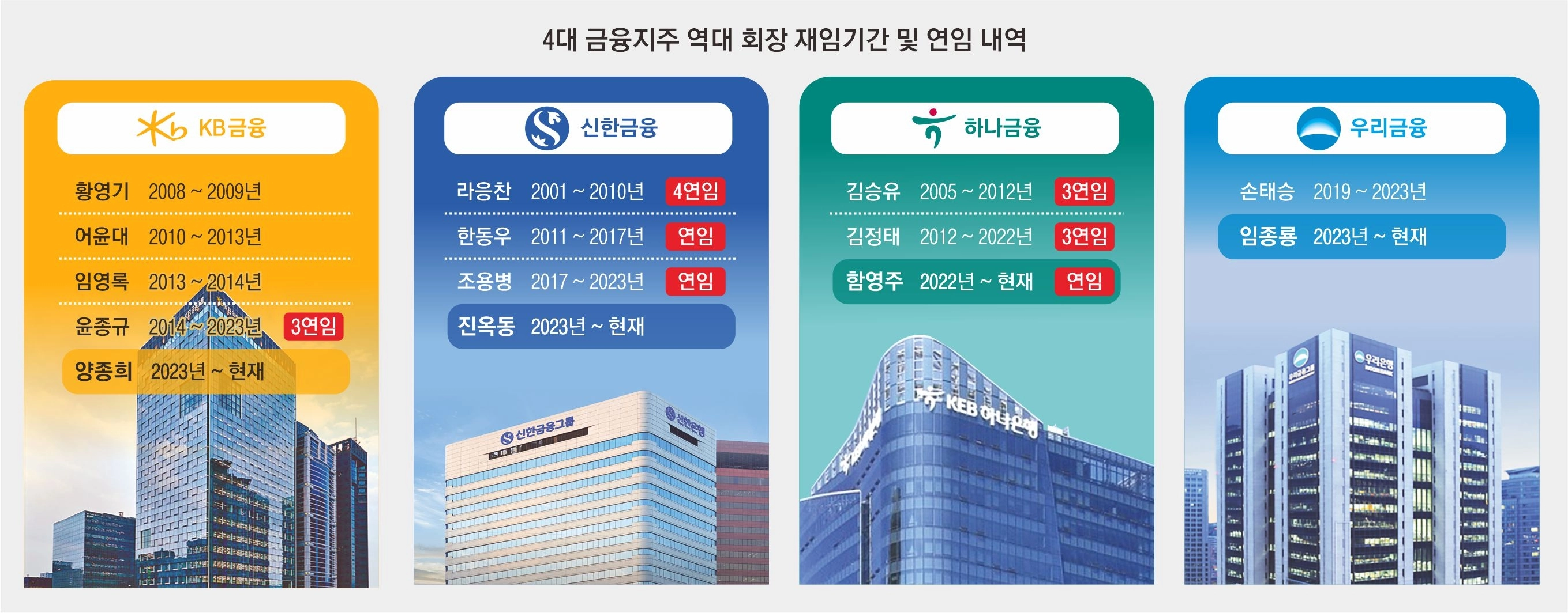 금융지주 회장의 연임 문턱이 크게 높아질 전망이다. 금융당국은 연임 횟수별로 주주 동의 요건을 차등 적용하는 방안을 유력하게 검토하고 있다. ‘연임’의 경우 출석 주주의 ‘3분의 2 이상’ 찬성을, ‘3연임’에는 ‘4분의 3’ 수준의 동의를 요구하는 방안이 논의되고 있다.