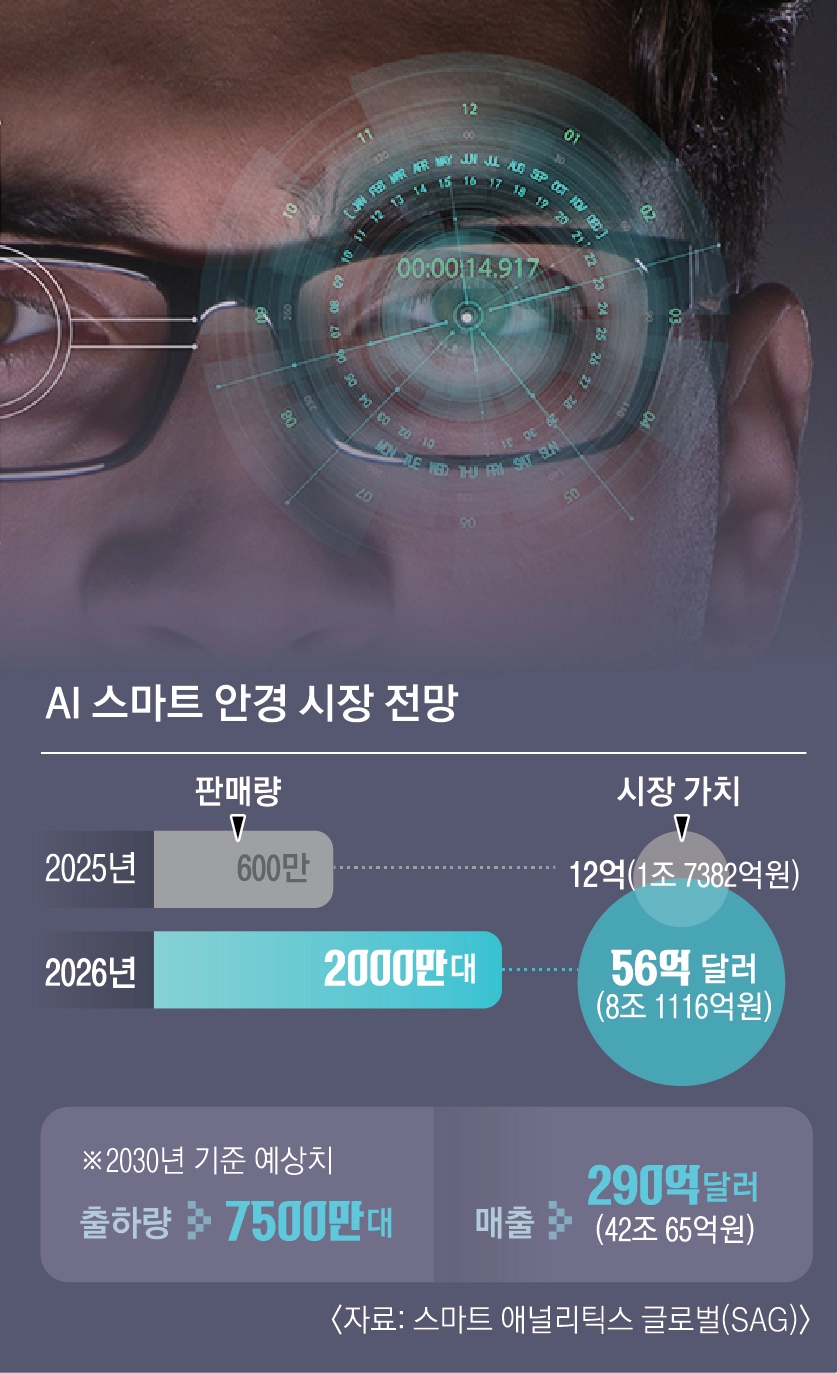 시장조사기관 스마트 애널리틱스 글로벌은 AI 스마트 안경 판매량이 지난해 600만대에서 올해 2000만대로 늘어나고 2030년에는 출하량이 7500만대에 이를 것으로 관측했다. 다만, 프라이버시 규제 마련과 킬러 앱 공급 등은 스마트 글랜스 대중화의 조건으로 제기된다.