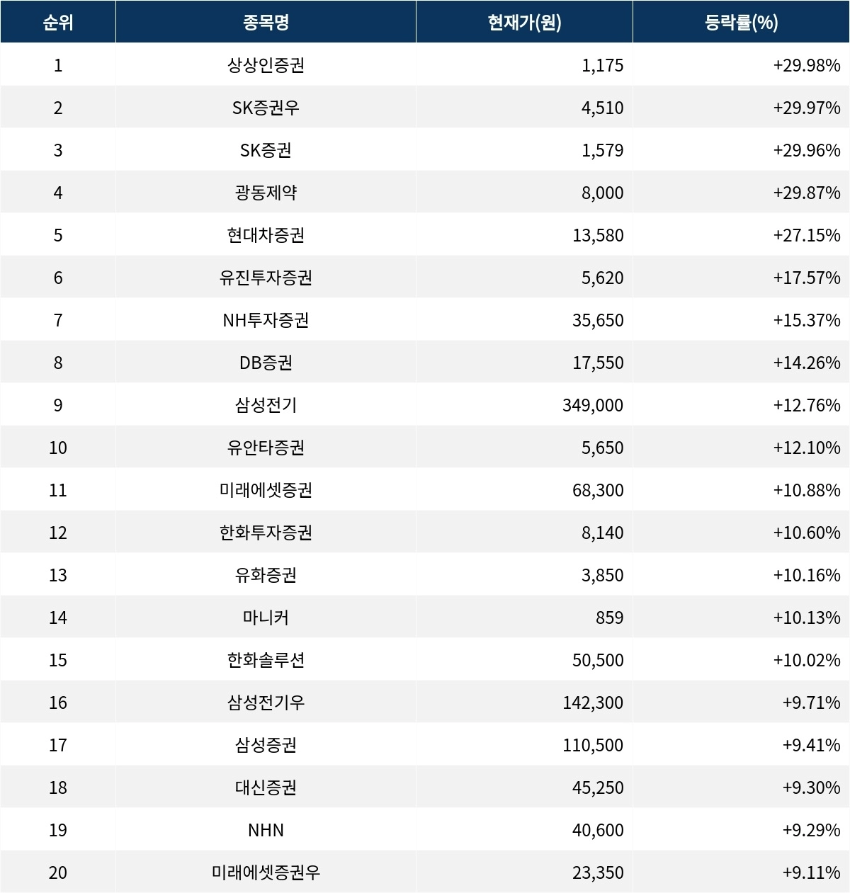 6위 유진투자증권(001200)은 현재가 5620원으로 17.57% 상승 중이다. 7위 NH투자증권(005940)은 현재가 3만 5650원으로 15.37% 상승 중이다. 8위 DB증권(016610)은 현재가 1만 7550원으로 14.26% 상승 중이다. 9위 삼성전기(009150)는 현재가 34만 9000원으로 12.76% 상승 중이다. 10위 유안타증권(003470)은 현재가 5650원으로 12.10% 상승 중이다.