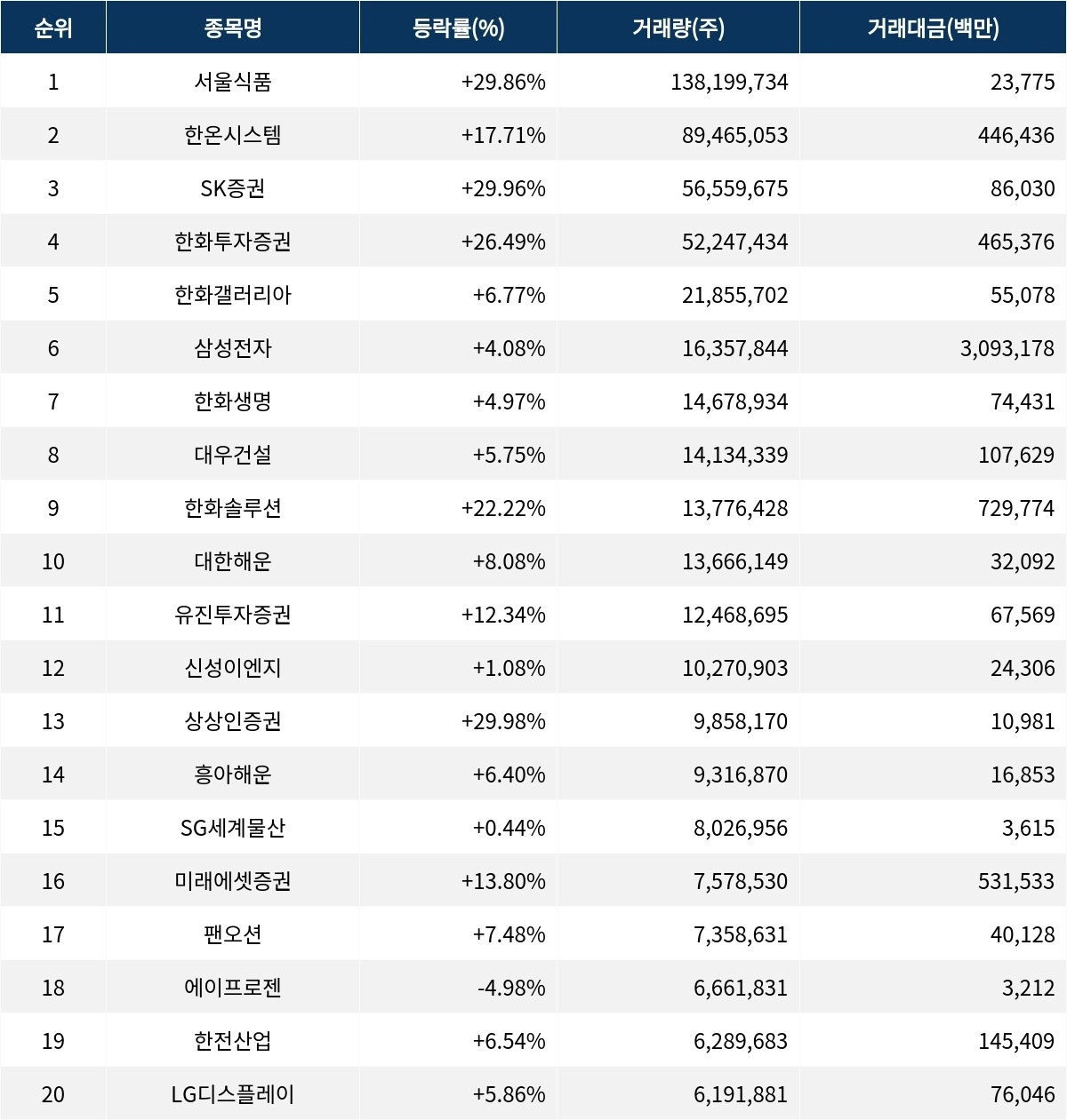 한편 거래량 상위 20위권 종목들은 유진투자증권(001200) ▲12.34%, 신성이엔지(011930) ▲1.08%, 상상인증권(001290) ▲29.98%, 흥아해운(003280) ▲6.40%, SG세계물산(004060) ▲0.44%, 미래에셋증권(006800) ▲13.80%, 팬오션(028670) ▲7.48%, 에이프로젠(007460) ▼4.98%, 한전산업(130660) ▲6.54%, LG디스플레이(034220) ▲5.86% 등의 성적을 기록하고 있다.