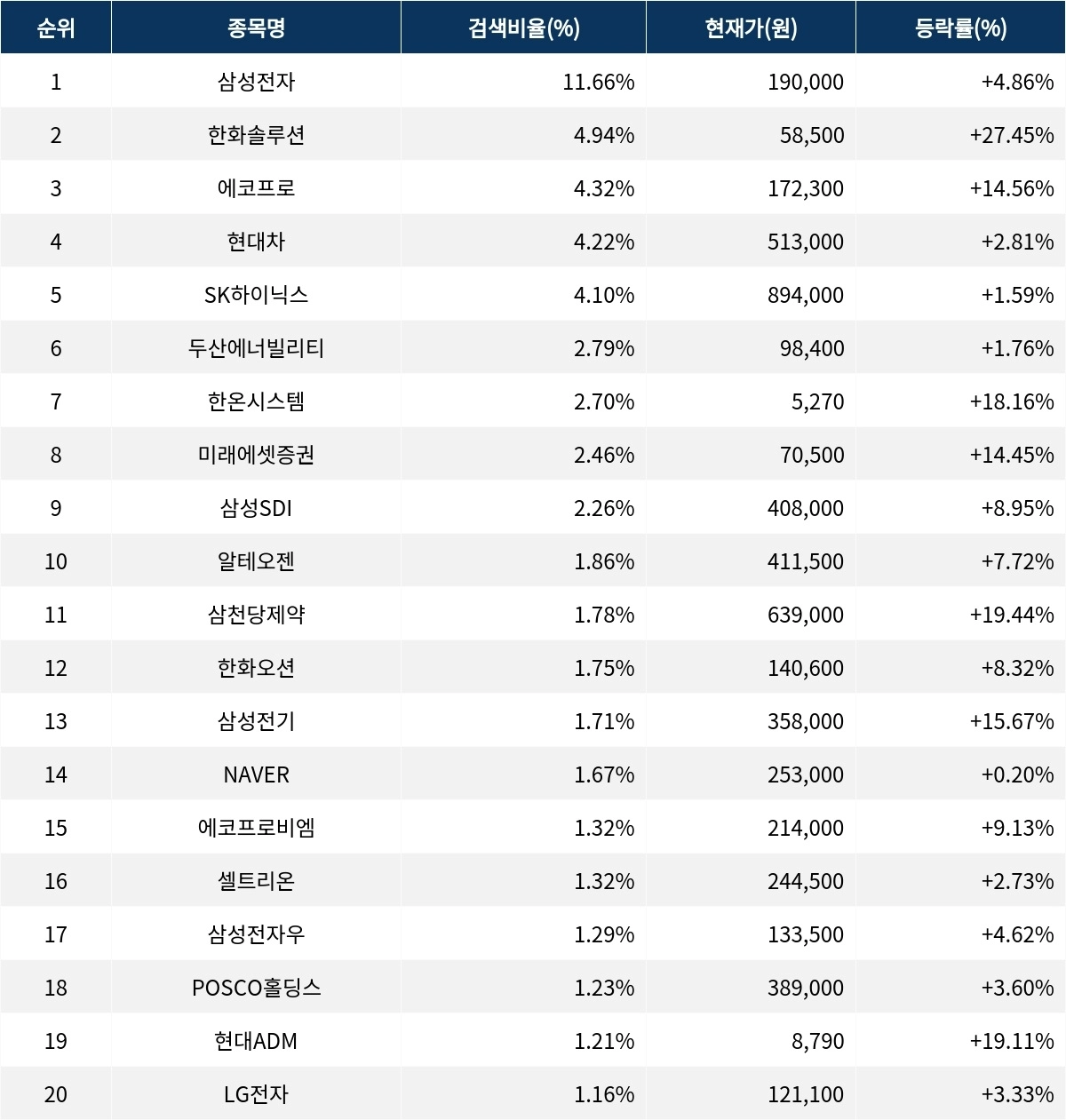 이어 검색비율 2위의 한화솔루션(009830)은 상승률 27.45%로 폭등 마감했다. 검색비율 3위의 에코프로(086520)는 14.56% 상승 마감했다. 검색비율 4위 현대차(005380)는 2.81% 상승 마감했다. 검색비율 5위 SK하이닉스(000660)는 1.59% 상승하며 강보합으로 마감했다.