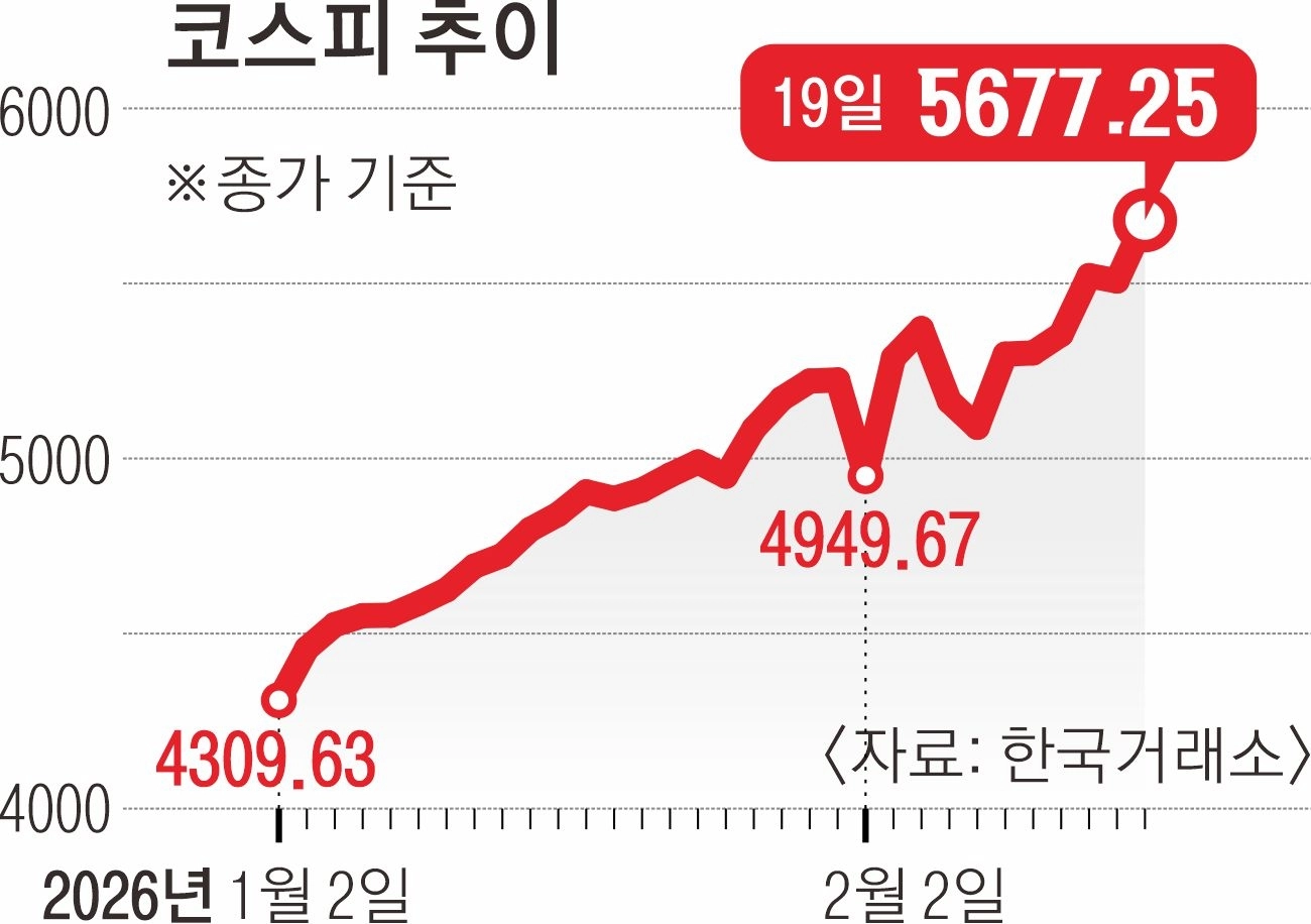 설 연휴가 지나고 첫 거래일인 19일 코스피가 5600선을 돌파하며 사상 최고치 기록을 또 갈아치웠다. 지수 상승을 견인한 삼성전자는 ‘19만 전자’(종가 기준)에 도달해 시가총액 기준 세계 14위에 올랐다. 코스닥은 올 들어 두 번째 장중 매수 사이드카가 발동됐고, 이후에도 강세가 이어지며 5% 가까운 오름폭을 보였다.