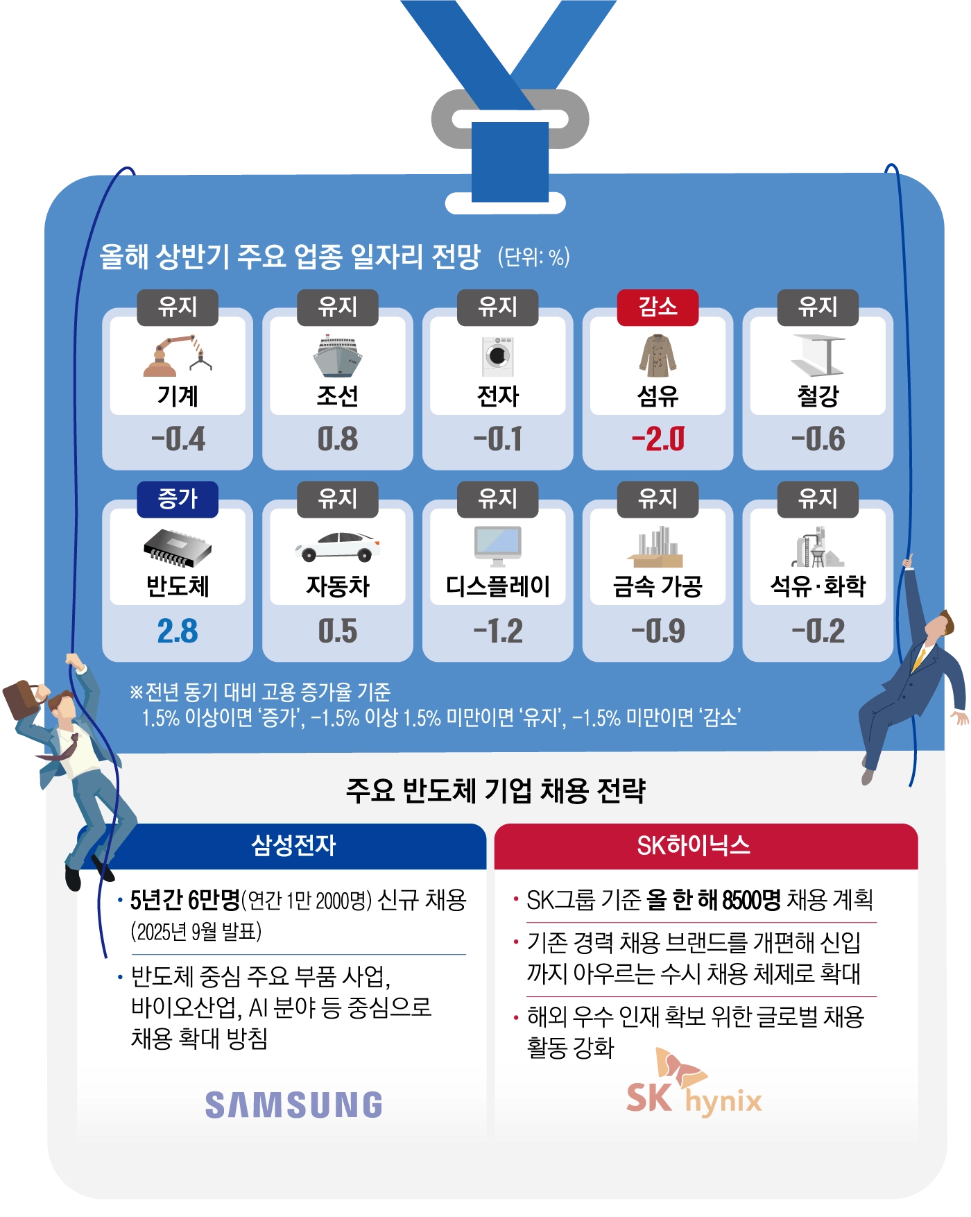 정부 지표도 같은 흐름이다. 한국고용정보원의 ‘2026 상반기 일자리 전망’에 따르면 10대 주력 업종 가운데 반도체는 유일하게 전년 대비 고용이 증가할 것으로 관측됐다. 상반기에만 4000명의 일자리가 순증할 전망이다. 전년 동기 대비 증가율은 2.8%로, 주요 업종 중 가장 높다. 고용정보원은 “인공지능(AI) 시장 성장에 따른 고부가 메모리 시장 호황 등으로 수출이 증가해 반도체 업종 고용이 증가할 것”이라고 전망했다.