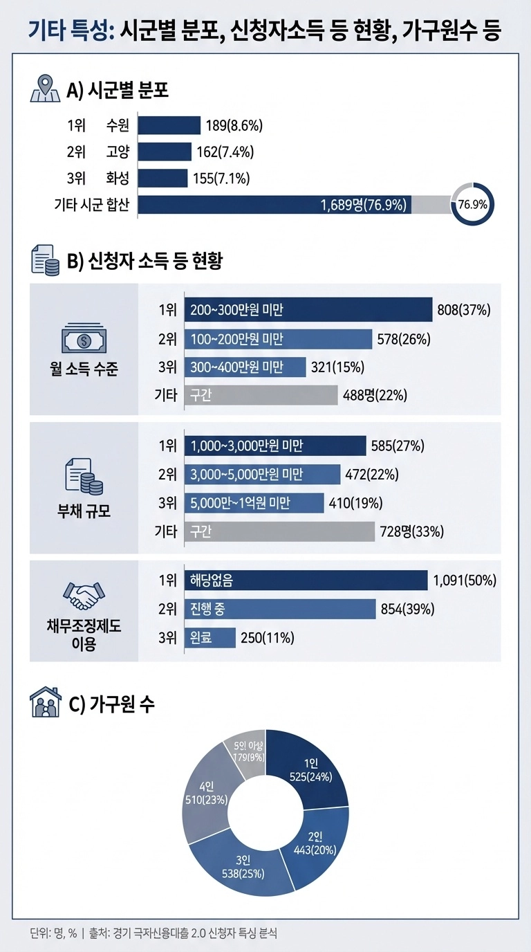 가구원 수는 3인 가구가 25%(538명)로 가장 많았고, 1인 가구와 4인 가구가 뒤를 이었다. 거주 지역은 수원시 8.6%(189명), 고양시 7.4%(167명), 화성시 7.1%(155명) 순으로, 대도시를 중심으로 신청이 집중됐다.