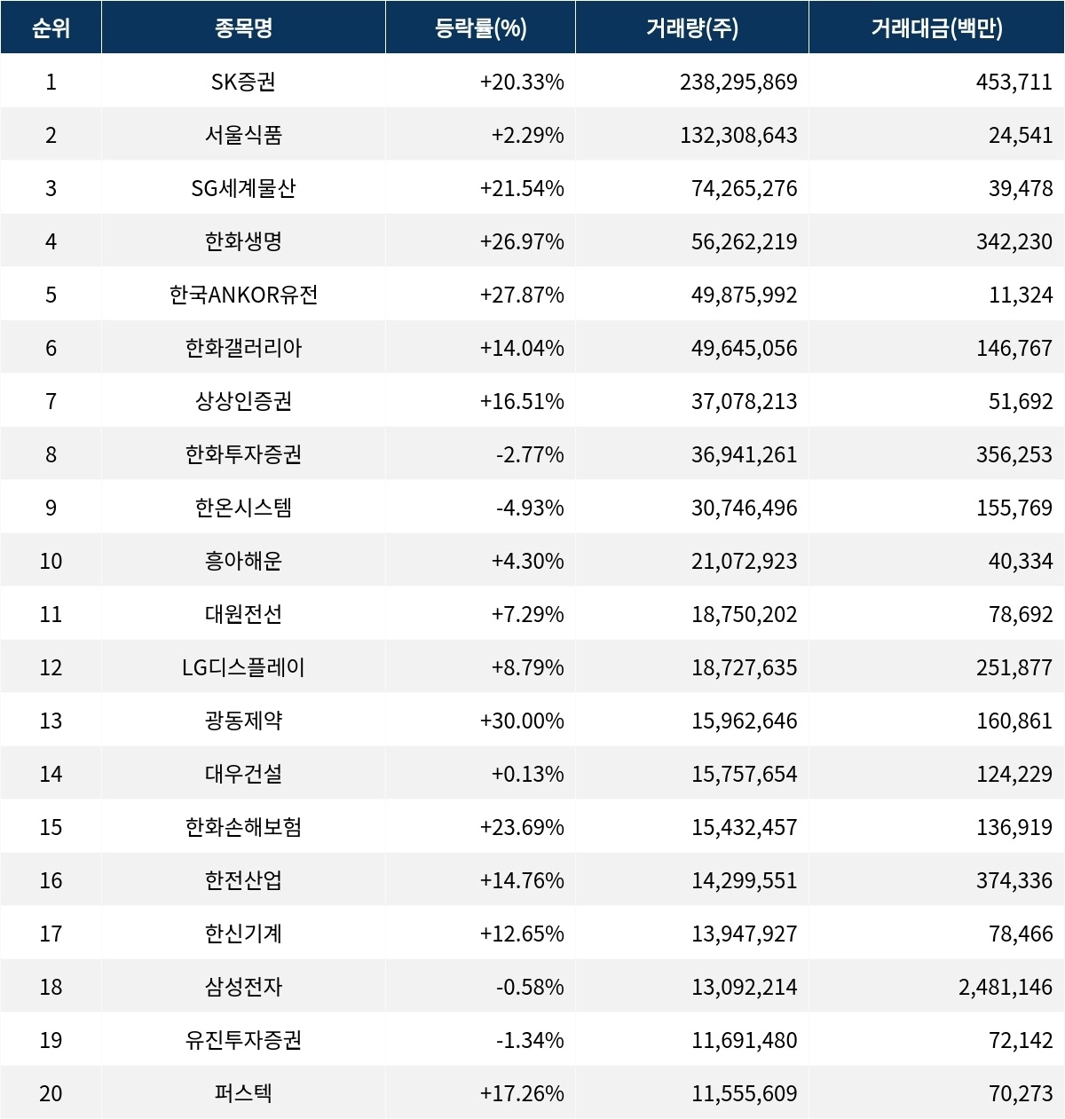한편 거래량 상위 20위권 종목들은 대원전선(006340) ▲7.29%, LG디스플레이(034220) ▲8.79%, 광동제약(009290) ▲30.00%, 대우건설(047040) ▲0.13%, 한화손해보험(000370) ▲23.69%, 한전산업(130660) ▲14.76%, 한신기계(011700) ▲12.65%, 삼성전자(005930) ▼0.58%, 유진투자증권(001200) ▼1.34%, 퍼스텍(010820) ▲17.26% 등의 성적을 기록했다.