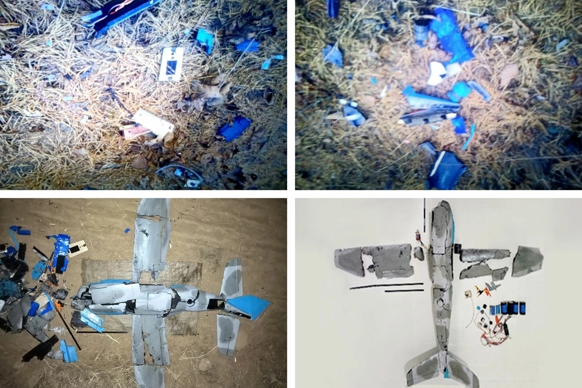 북한 “한국 무인기 3시단10분 동안 비행하며 중요대상물 촬영” 북한 노동당 기관지 노동신문은 10일 인민군 총참모부 대변인 성명을 게재하며 “지난 1월 4일 국경 대공 감시 근무를 수행하던 우리 구분대들은 인천시 강화군 송해면 하도리 일대 상공에서 북쪽방향으로 이동하는 공중 목표를 포착하고 추적하였으며 우리측 영공 8㎞계선까지 전술적으로 침입시킨 다음 특수한 전자전자산들로 공격하여 개성시 개풍구역 묵산리 101.5고지로부터 1200m 떨어진 지점에 강제추락시켰다”고 보도했다. 사진은 추락한 무인기 잔해. 평양노동신문·뉴스1