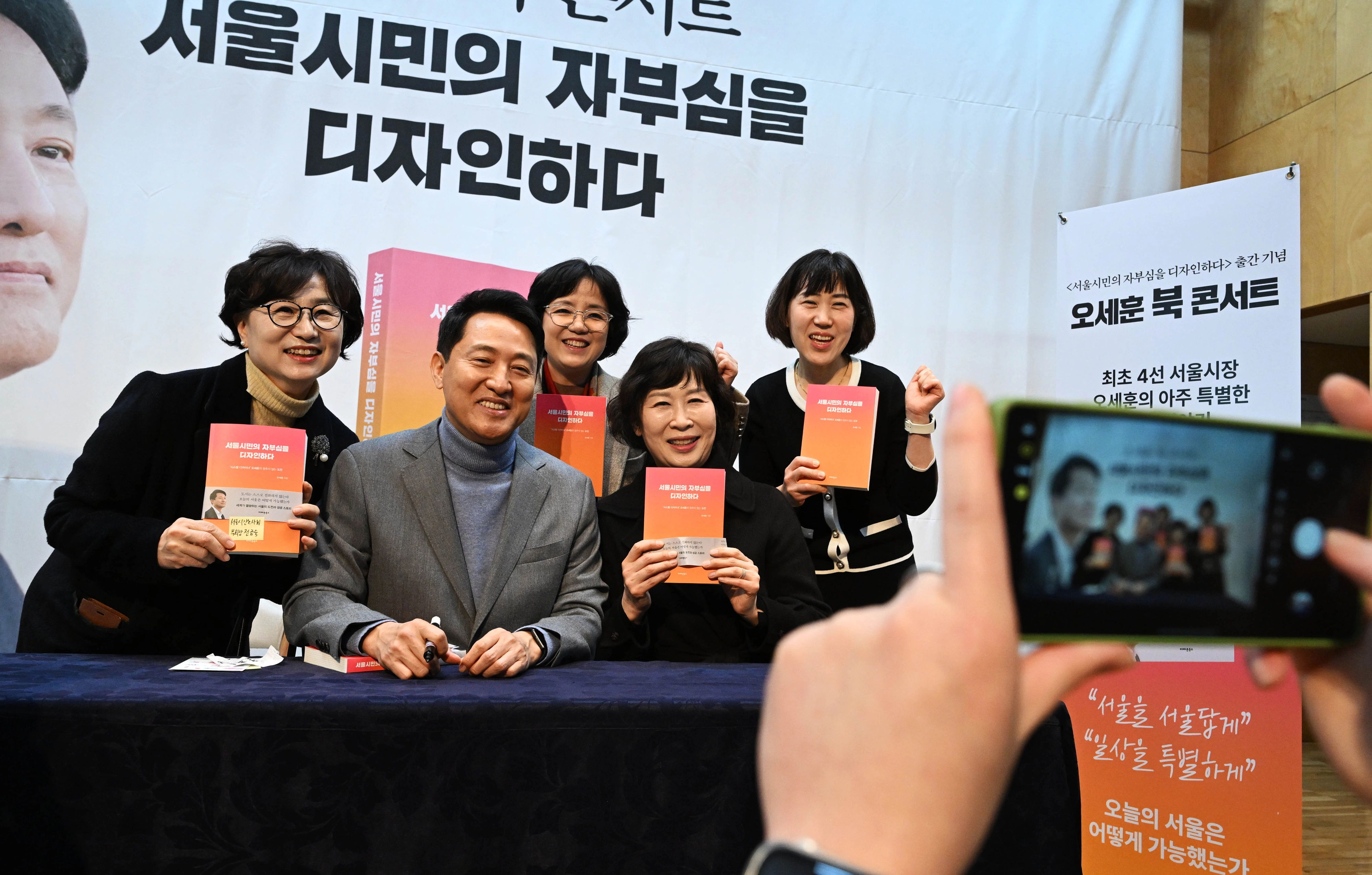 오세훈 서울시장이 22일 서울 마포구 청년문화공간JU에서 열린 ‘서울시민의 자부심을 디자인하다’ 출간기념회에서 참석자들과 기념 촬영을 하고 있다.