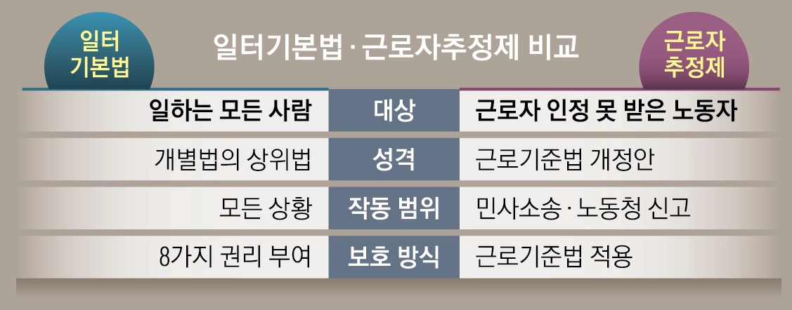 A. ‘권리 밖 노동자’를 포괄적으로 보호하기 위해서다. 일터 기본법이 큰 틀에서 노동자의 권리에 대한 인식과 지원 체계를 규정하는 ‘총론’이라면, 근로자 추정제는 노동 분쟁에서 실질적인 보호를 제공하는 ‘각론’에 해당한다. 당장 일터 기본법만으로는 특수고용·플랫폼 노동자를 실질적으로 보호하기 어렵지만, 근로자 추정제가 함께 도입되면 기존 근로기준법상 강력한 의무를 부여할 수 있다. 따라서 두 법은 상호 보완적인 성격을 띤다.